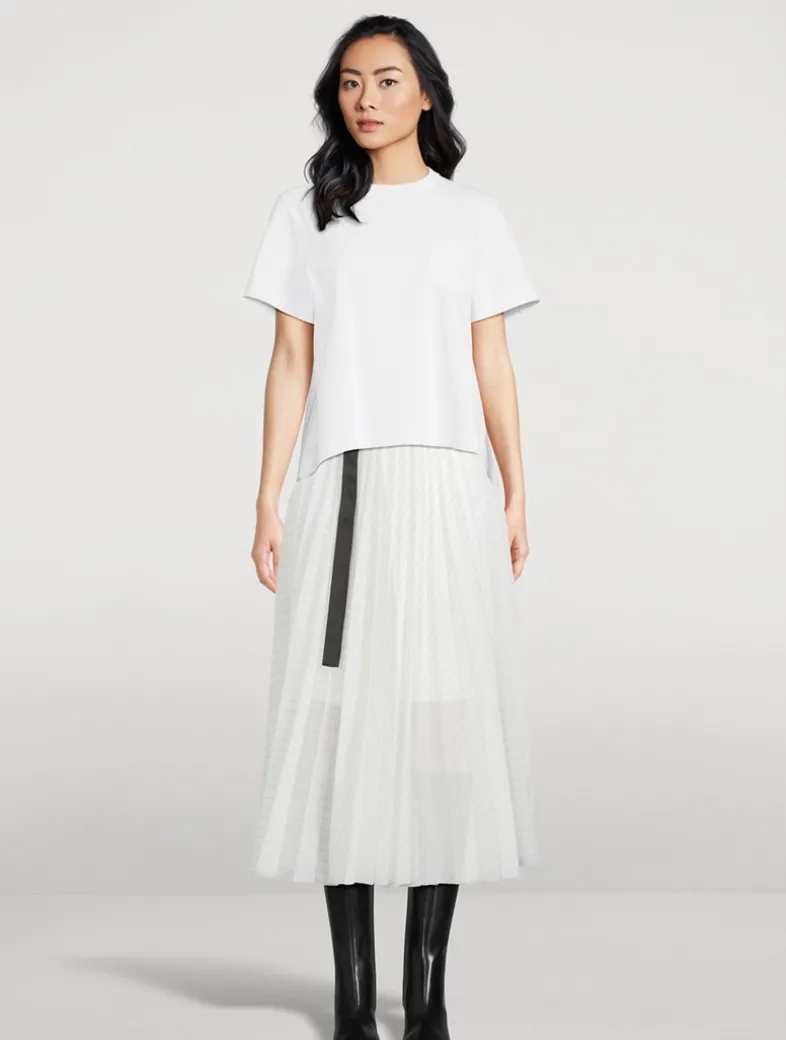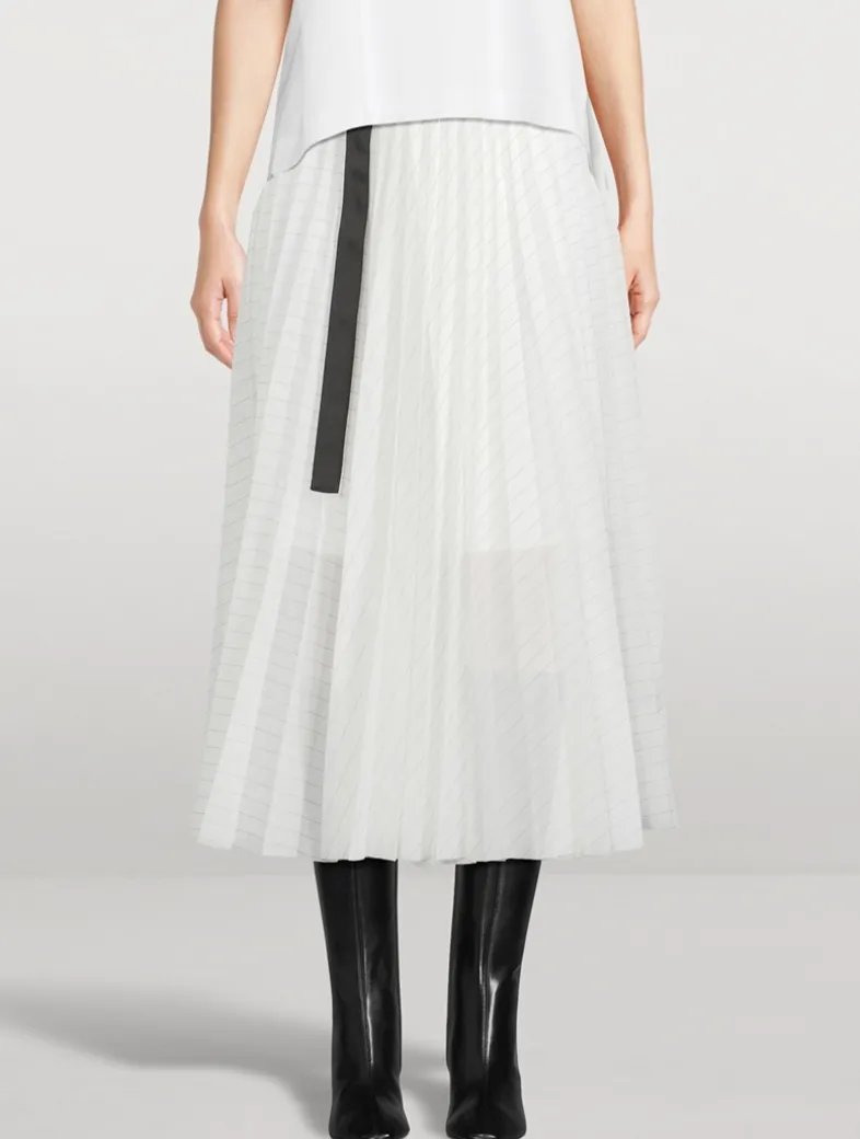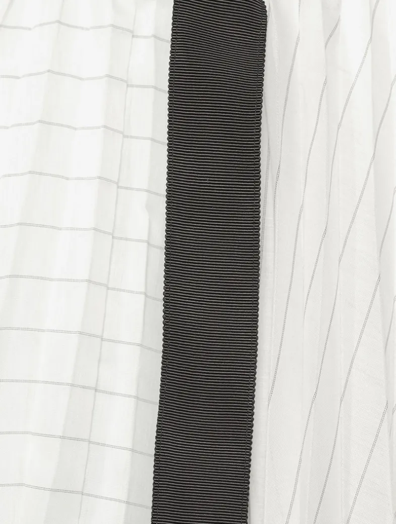 Constructed with a pleated finish and partial lining, this fluttering organza skirt is printed with delicate stripes. Made in Japan, the midi is cut to an A-line silhouette and topped with a contrasting fabric belt.
