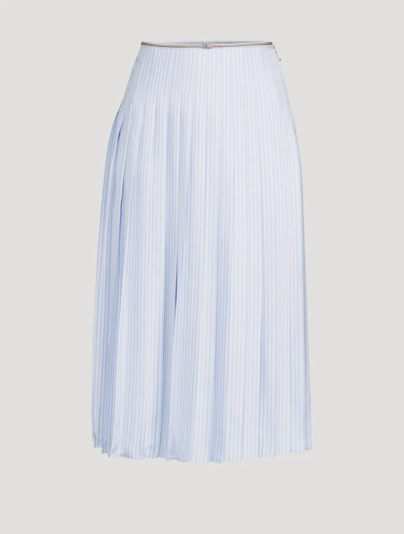 This enchanting skirt marries the enduring elegance of classic suiting with a playful, spirited bow decorated in signature Thom Browne stripes. Crafted from silk twill, it has a pleated design and a mid-calf length.