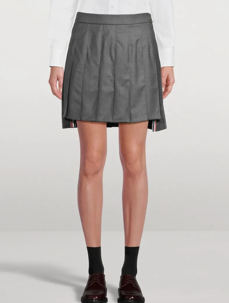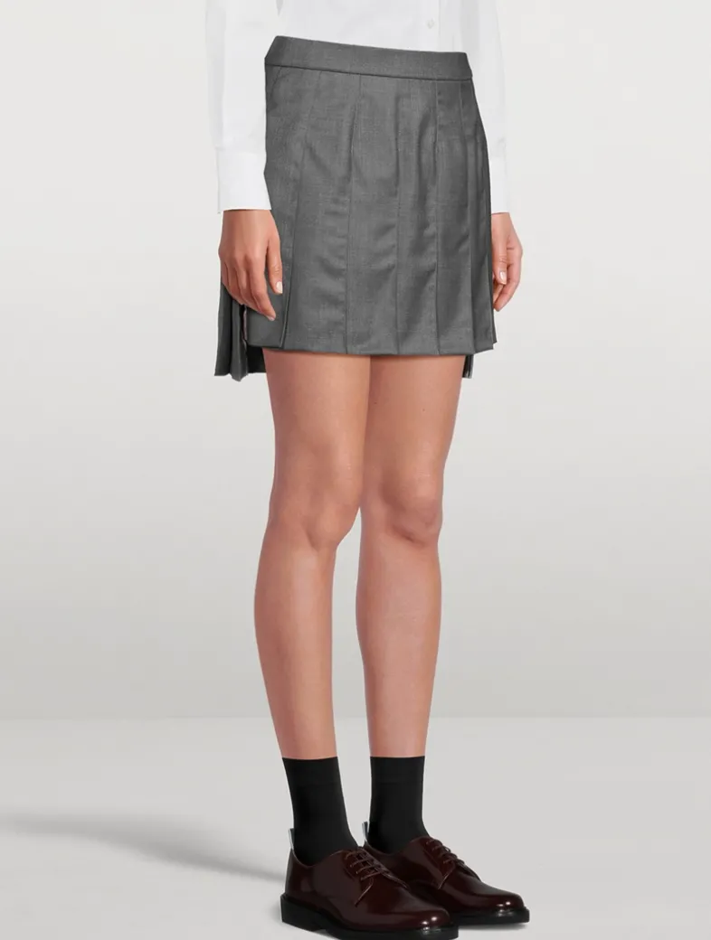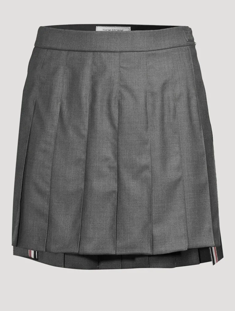 Made in Italy, this short skirt is designed with a dropped-back hem and signature grosgrain stripe detailing. Crafted in super 120s wool twill, the pleated mini is finished with a side zip closure and grosgrain loop tab at the back waist.
