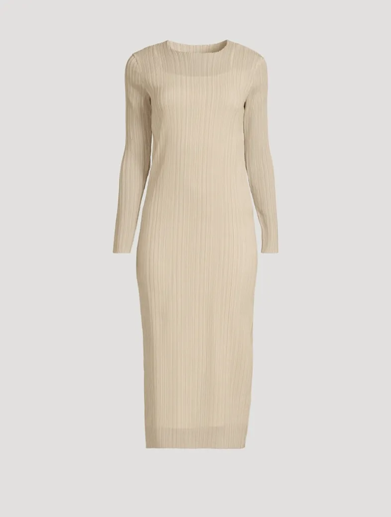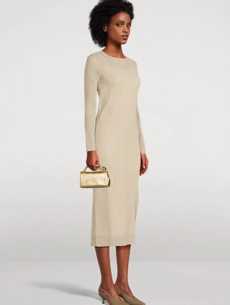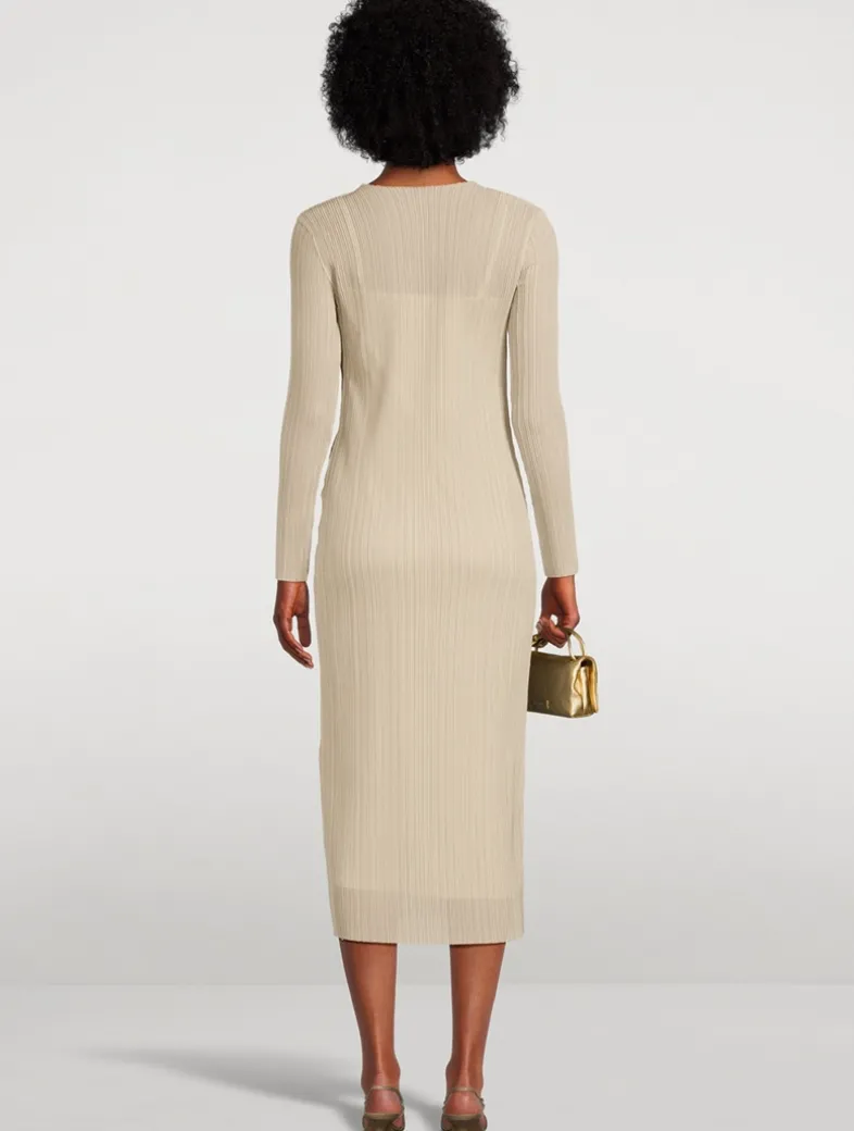This slim, column-like dress is constructed with sheer two-tone crinkled pleating throughout, lending it texture and dimension that beckon a closer look.
