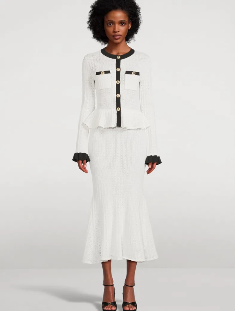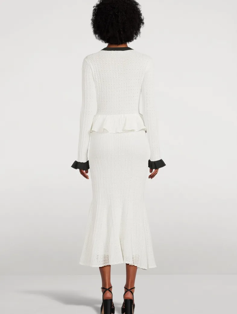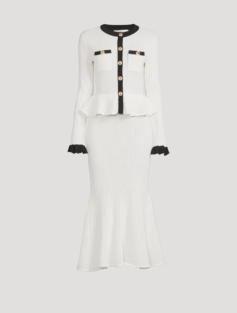 Designed to flatter with its peplum waist and flared hem, this white pointelle knit dress features contrast trims for an extra preppy edge, a gold button closure down the front, fully lined fabric with stretch.