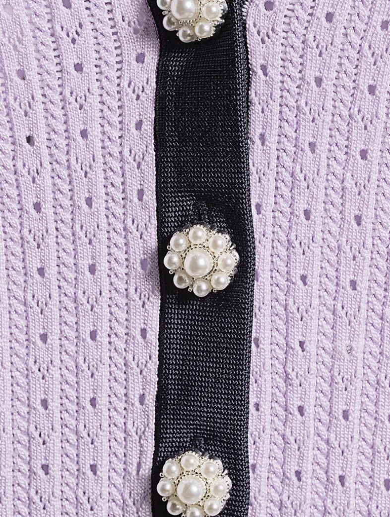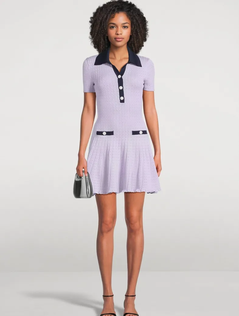 Bold and feminine in a pointelle knit, this dress—with its body-hugging bodice and flared skirt—was designed to flatter your form. Contrast detailing completes the look.