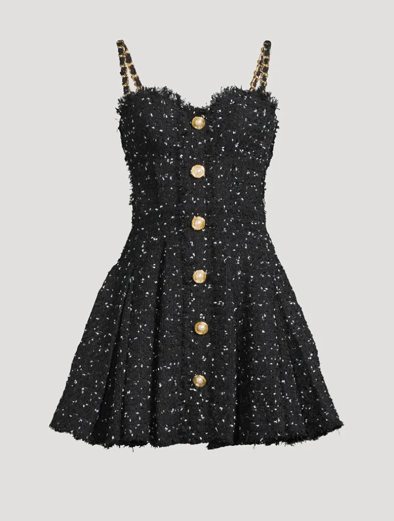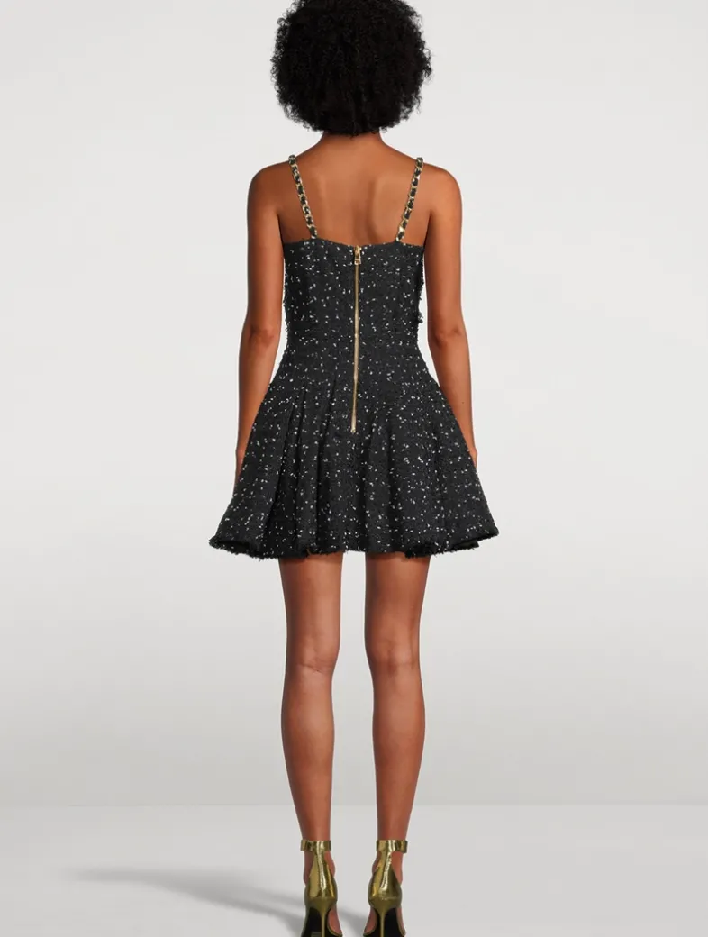This mini mixes preppy styling with polished gold-tone accents. Crafted from polka dot tweed, it is cut to a fit-and-flare silhouette with a reinforced bodice and raw-edge hems. Its straps are interlaced with metal chains, it has