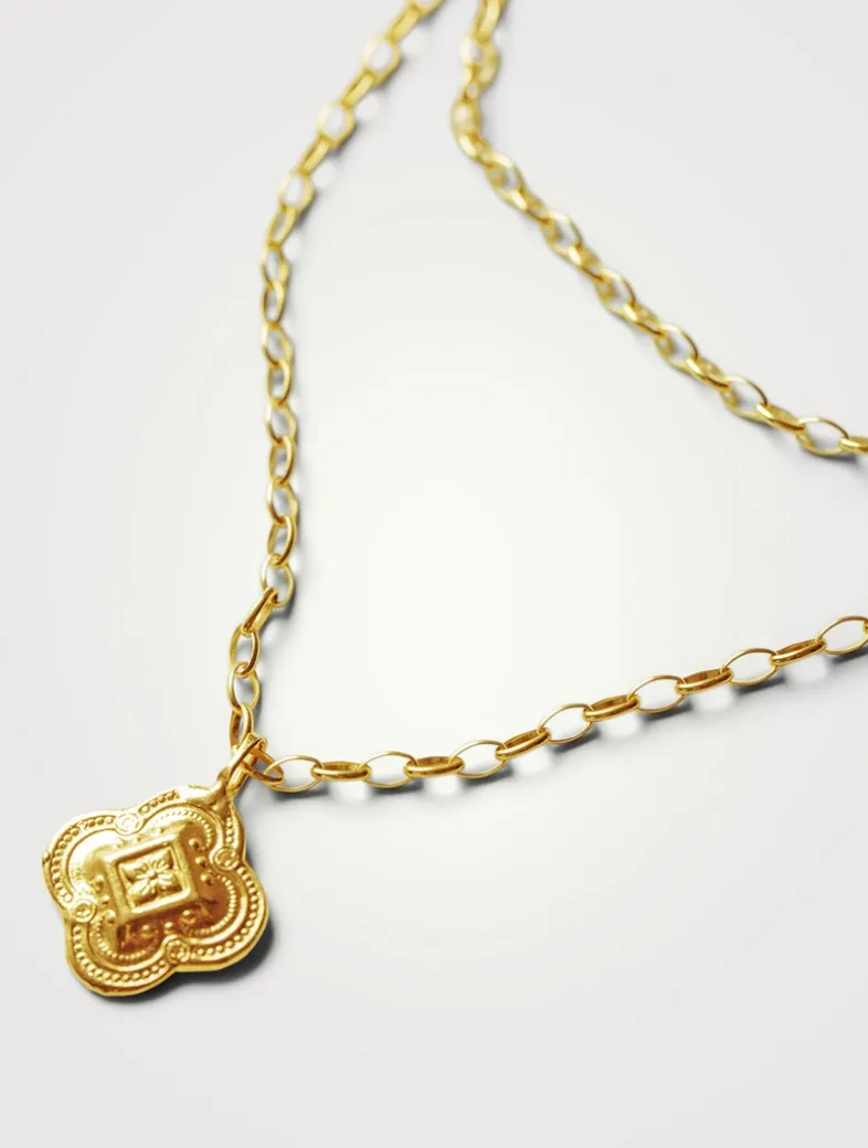 Designed and made in Canada, the Pombaline wrap necklace, inspired by Portugal’s 18th-century neoclassical elegance, features intricate geometric azulejo tilework on a bold oval link chain, offering a versatile, layered look when wrapped around the neck.