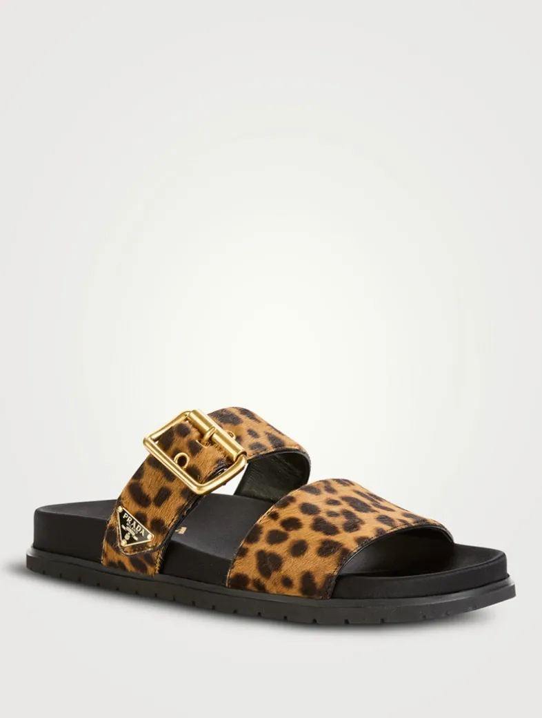 These sandals feature a hybrid silhouette that combines sporty details with the refined touch of leather brightened by a leopard print. The footwear defined by metal buckles is completed by comfortable rubber soles and the signature touch of the enamelled metal triangle logo.