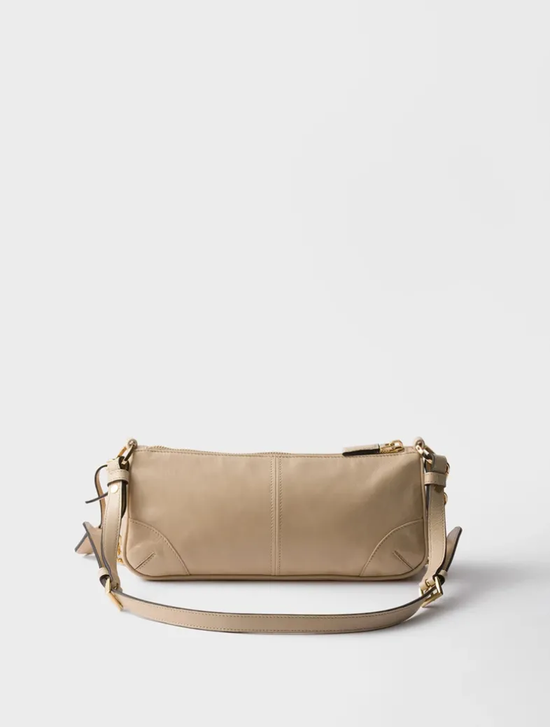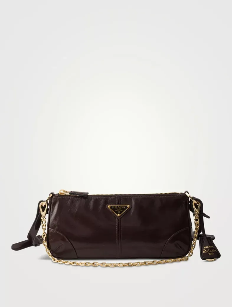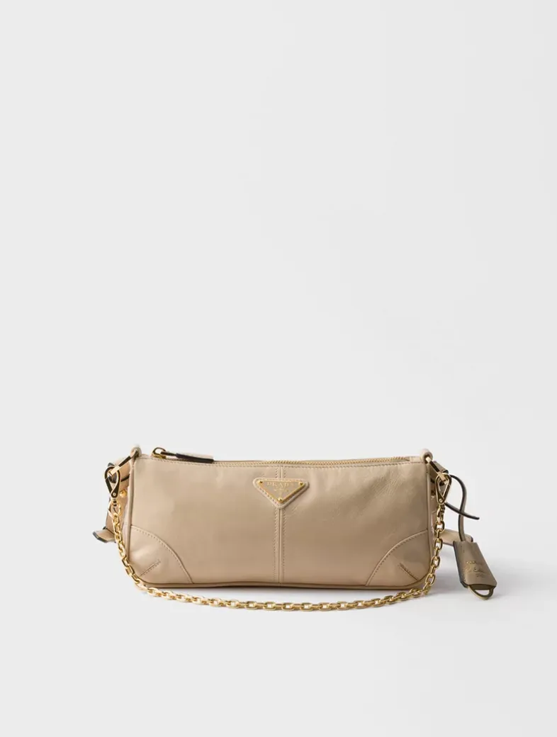 Brushed leather details Removable chain handle Shoulder strap Detachable, adjustable leather handle, length: 70 cm Maximum length 75 cm – Minimum length 65 cm – Maximum drop 35 cm- Minimum drop 30 cm Removable leather key chain Metal hardware Enameled metal triangle logo on the front Zipper closure Logo-print nylon lining