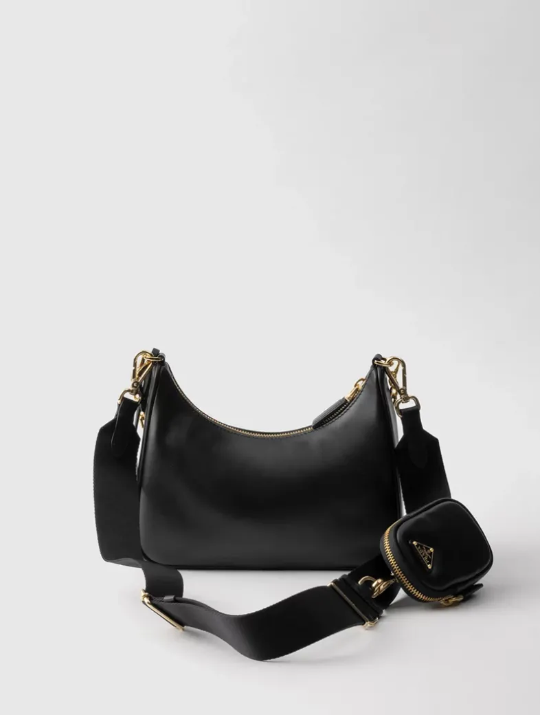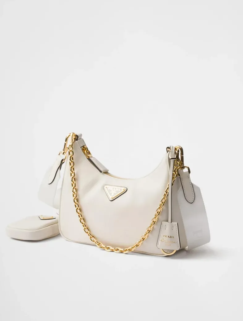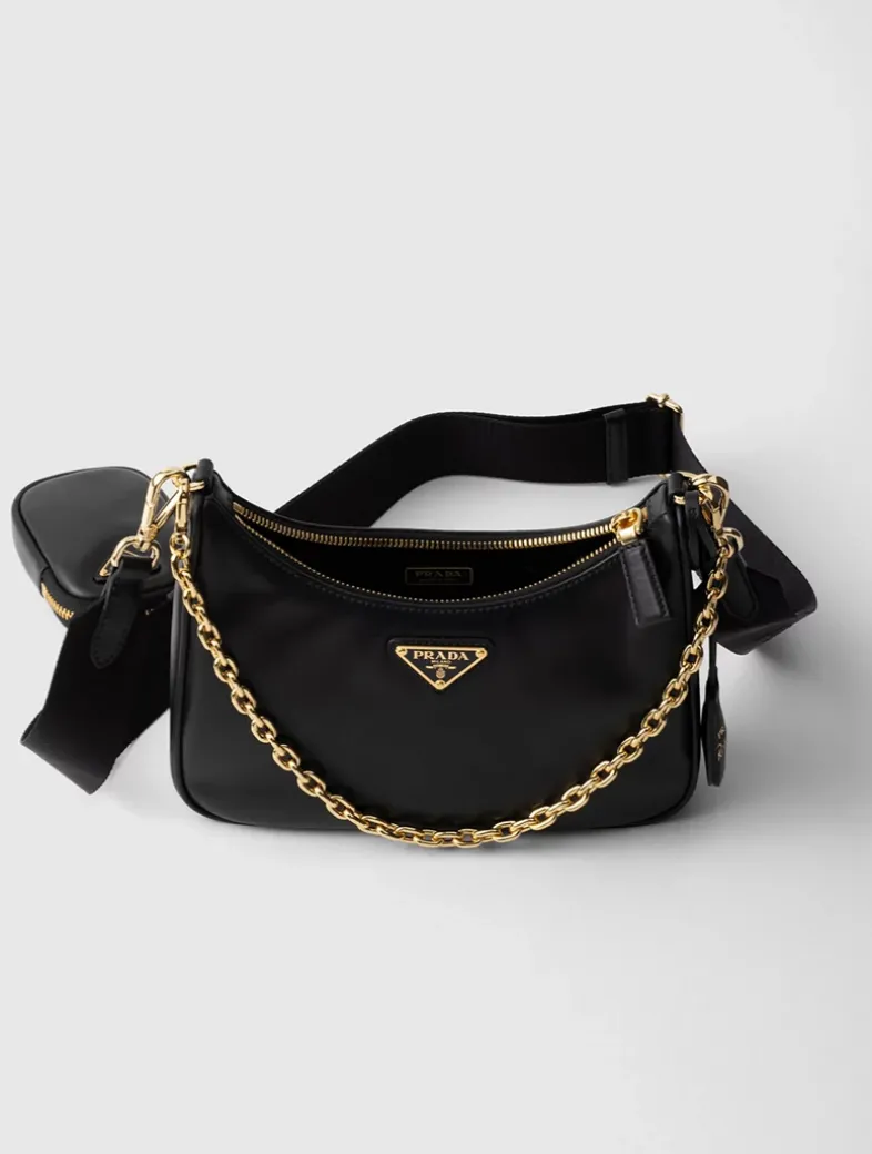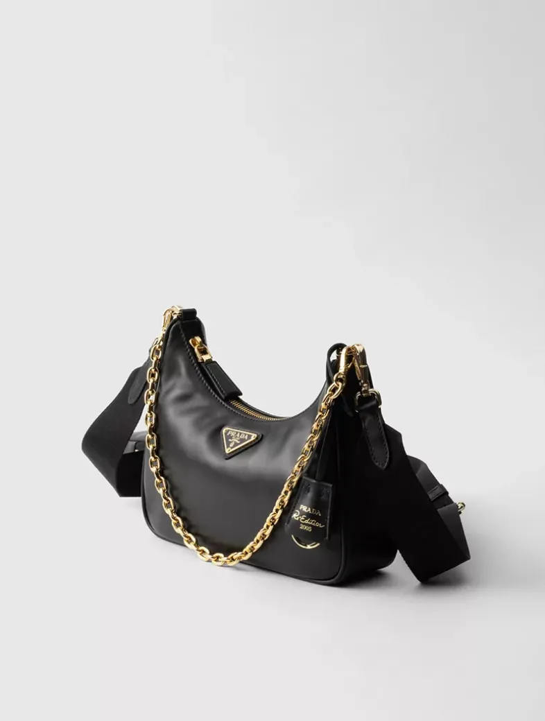 Removable chain handle Detachable, adjustable logo-print woven tape shoulder strap, length: 85 cm. Maximum length 104 cm – Minimum length 70 cm – Maximum drop 60 cm- Minimum drop 43 cm Removable leather zipper pouch and Re-Edition key ring Metal hardware Enameled metal triangle logo on the front Zipper closure Logo-print nylon lining