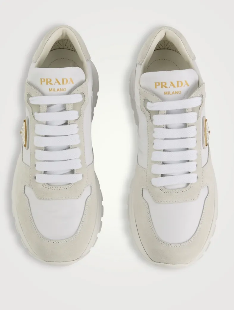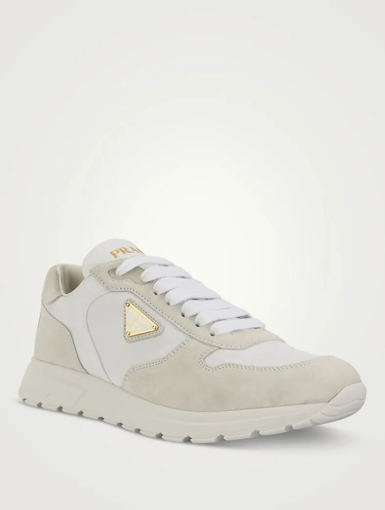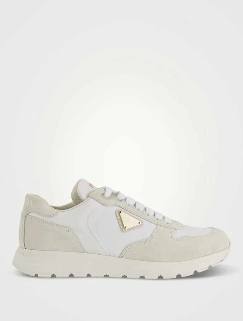 Prax sneakers combine a contemporary design with details that are emblematic of Prada collections. The enamelled metal triangle logo embellishes these sporty suede and recycled nylon shoes completed by chunky rubber soles.