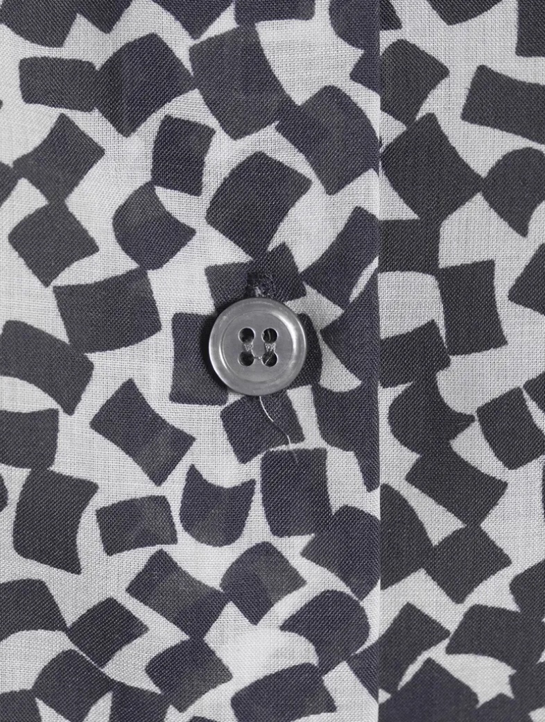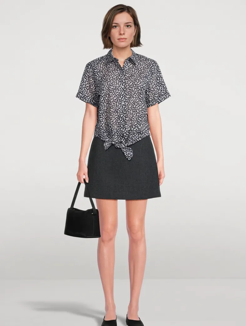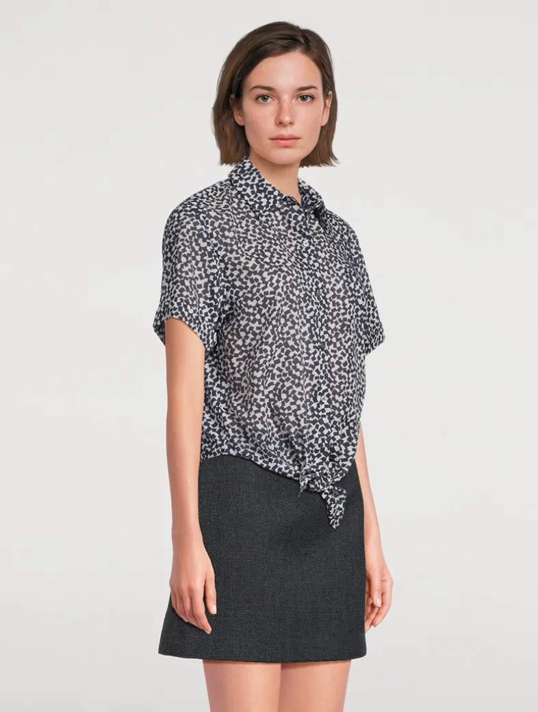 This classic short-sleeve shirt features a tie-front detail, buttoned closure, and pointed collar.