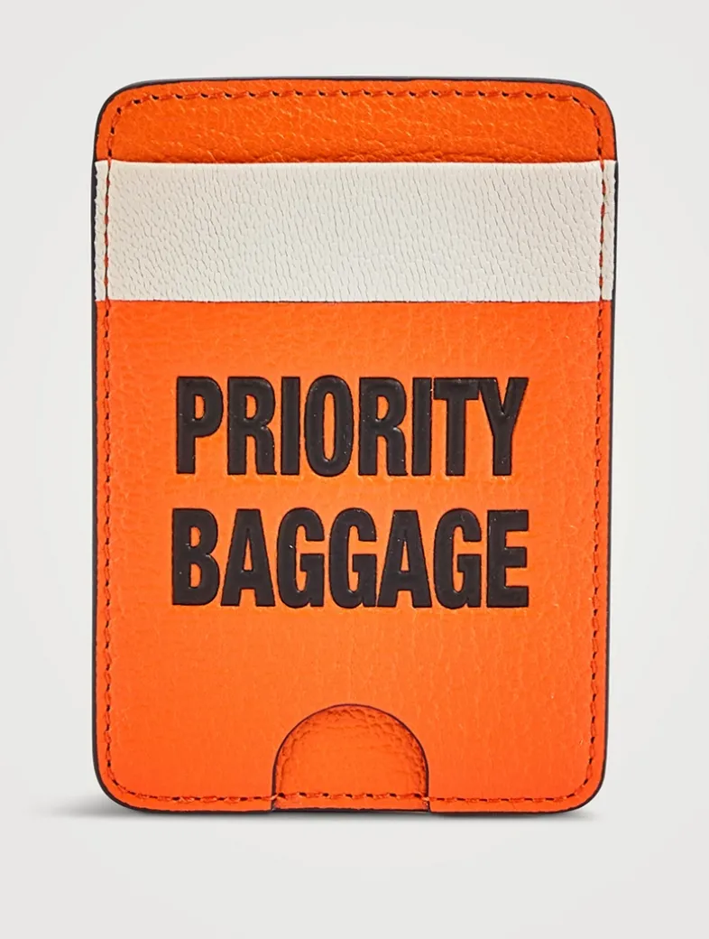 A cheerful take on the classic card holder, this one is crafted from capra leather and printed with the words ‘Priority Baggage’—a nod to luggage labels. It has space for essential cards, attaching to an iPhone (12 or later) via its magnetic back.