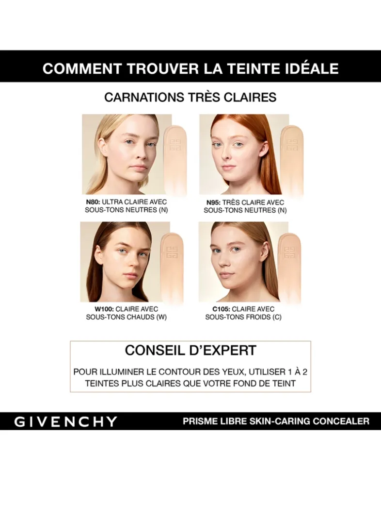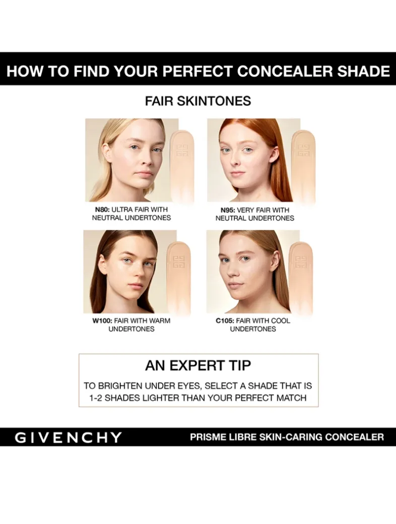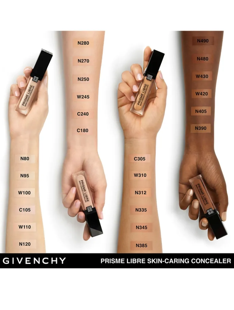 Conceal, correct and care with the Givenchy Prisme Libre Skin-Caring Concealer. The revolutionary new hydrating 24H wear concealer formulated with 95% natural origin ingredients. The water-resistant formula of this medium coverage, multi-purpose, concealer illuminates as it provides 24H hydration and radiance, while offering a natural result. Instantly, the cooling effect of the creamy texture creates a refreshing sensation on the eye area while improving skin quality. The result is a smoother, hydrated, lifted, and more even eye area.