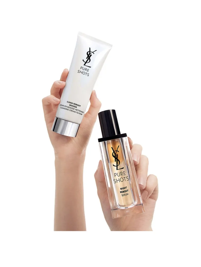 New Pure Shots Clean Reboot Mousse, YSL Beauty’s breakthrough cream-to-foam cleanser. A gentle non-drying cleansing technology powered by a pure shot of purifying actives: Amino acids and refreshing jasmine flower extract. Its transformative cream texture metamorphosis into a generous fine foam, removing effortlessly all urban life impurities and makeup residues. Instantly, skin is purified & sebum excess controlled. Day after day skin is more balanced and refined with a healthy glow. Use it as the first step to prepare your skin for the full Pure Shots skincare routine.