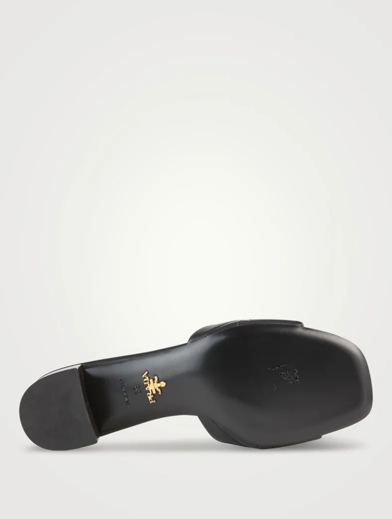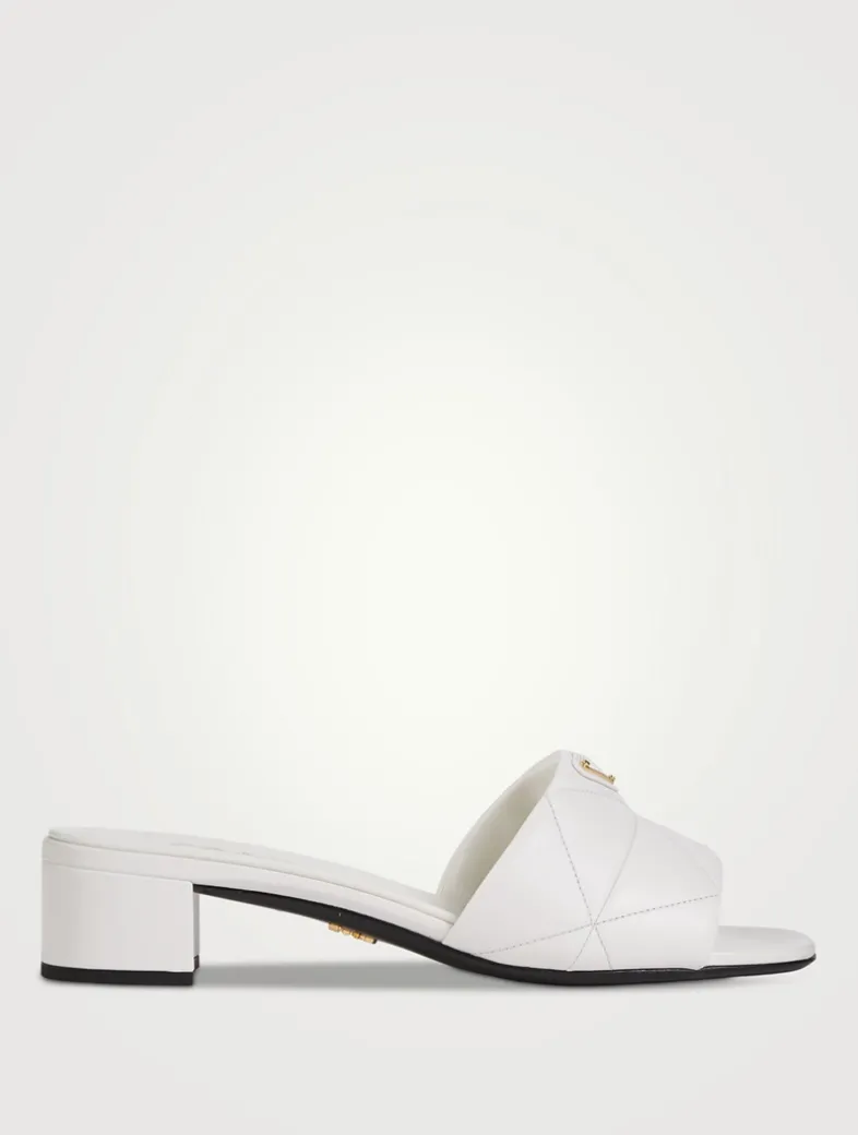 Prada’s emblematic triangle logo is reinterpreted in the quilted patchwork motif that animates the strap of these soft leather sandals. The slip-on design with low block heel is decorated with the metal lettering logo for an iconic accent.