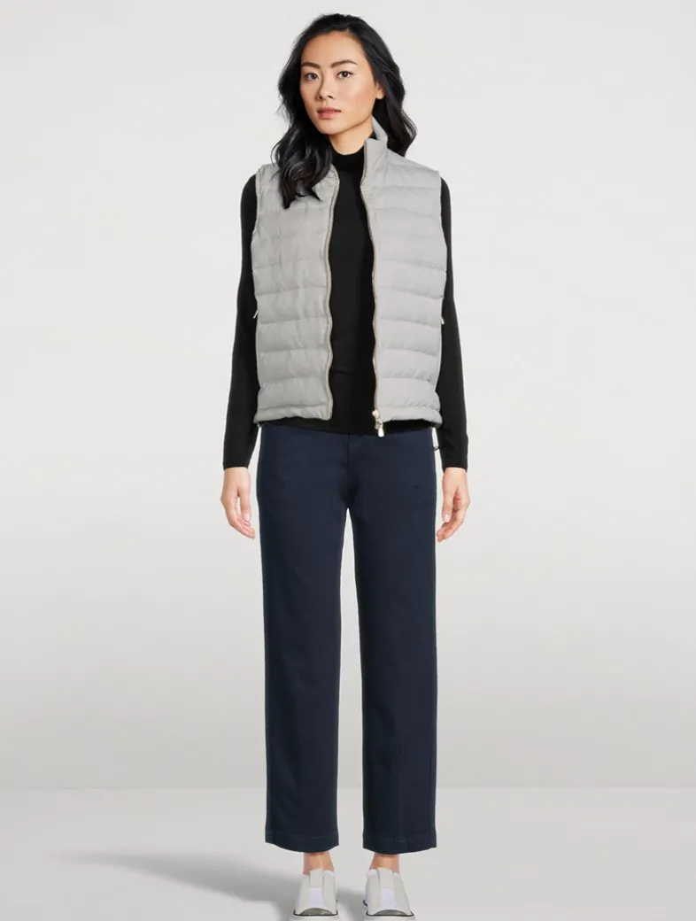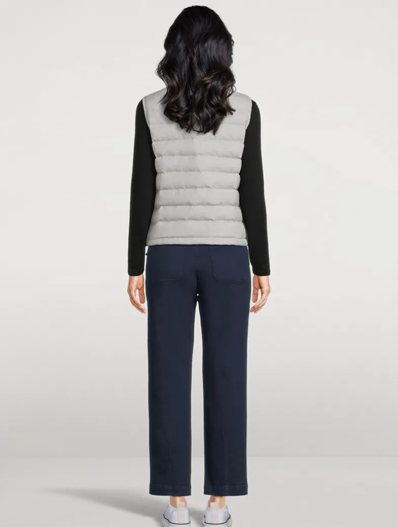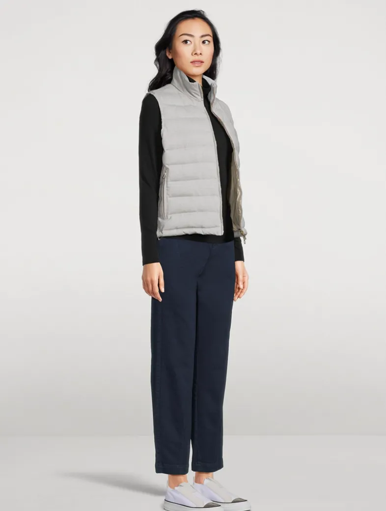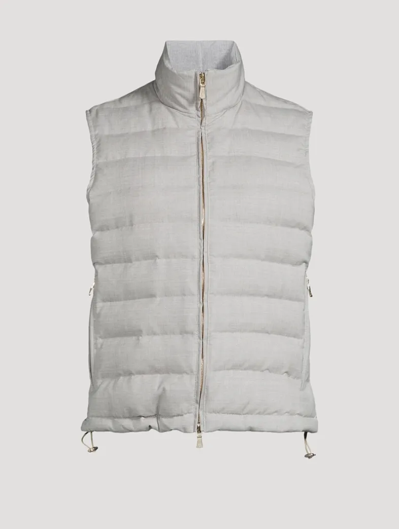 This sleeveless wool-blend topper has a stand collar and zipped pockets at the waist. It has a softly padded body with a quilted finish, adding a cozy feel to the piece.