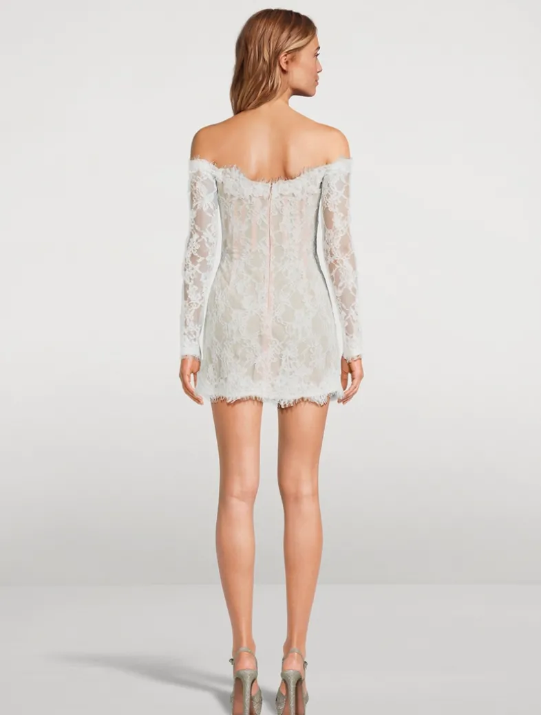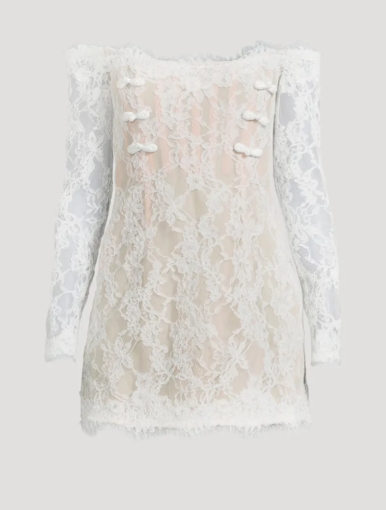 This long-sleeve lace mini dress is designed with a fully boned bodice. It has a face-framing off-the-shoulder neckline and features scalloped lace trim and signature hand-tied pipa button detail.