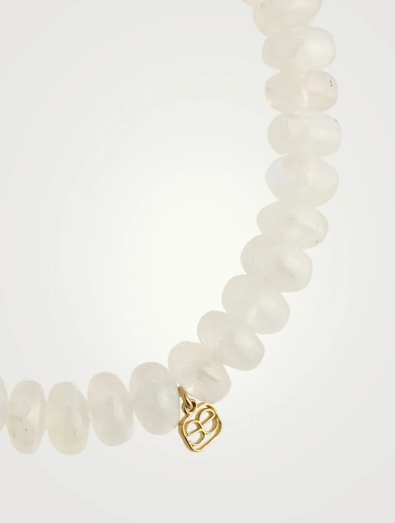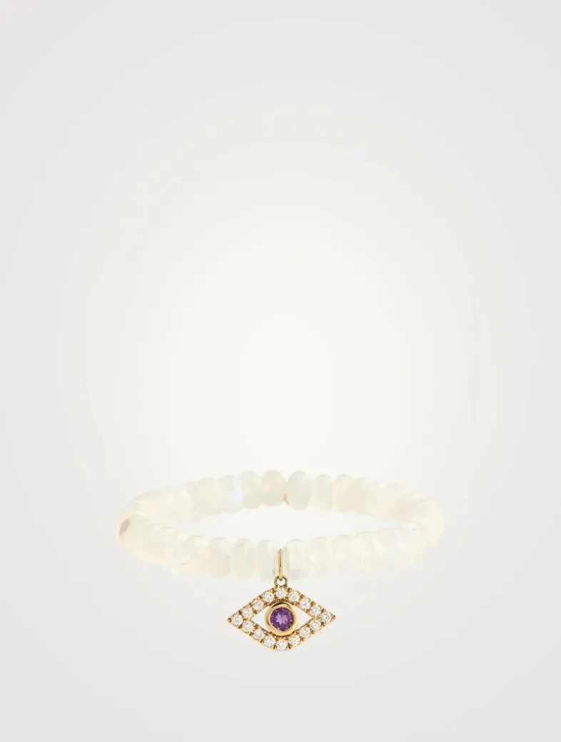 Set on a strand of rainbow moonstone smooth rondelle beads, this bracelet features a 14k gold extra large bezel diamond evil eye charm. All Sydney Evan beaded bracelets are strung on a stretch cord along with a 14k gold SE logo charm.