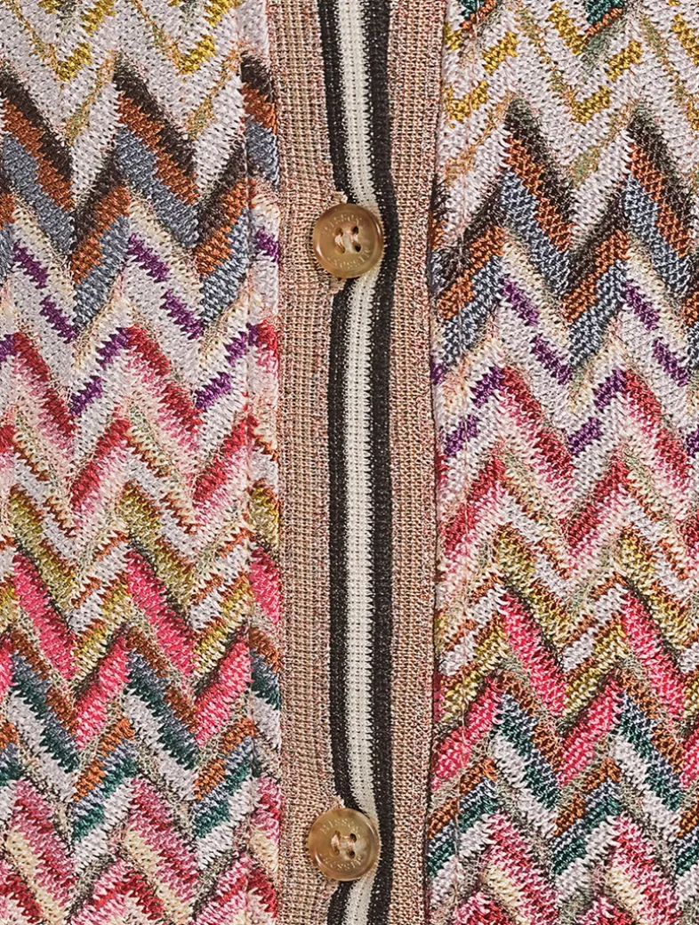 With a refined and modern design, this long cardigan made from a viscose blend is perfect for completing your looks. The raschel knit pattern, enriched with lamé details, recalls Missoni’s iconic chevron motif.
