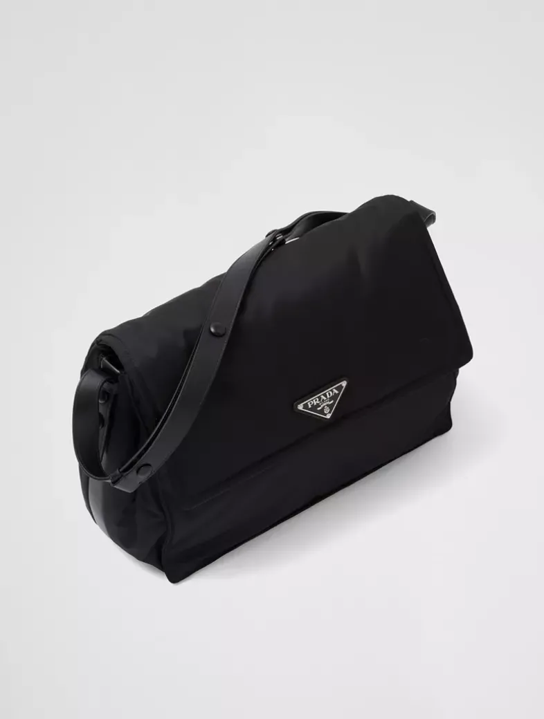 Adjustable leather shoulder strap Zipper pocket on the back Metal hardware Enameled metal triangle logo on the flap Flap closure with magnet Re-Nylon lining with two pockets, including one with zipper