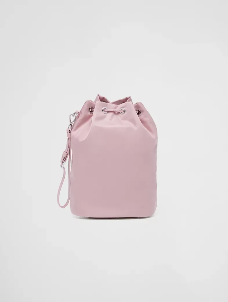 Drawstring closure Enameled metal triangle logo Detachable leather handle Re-Nylon lining