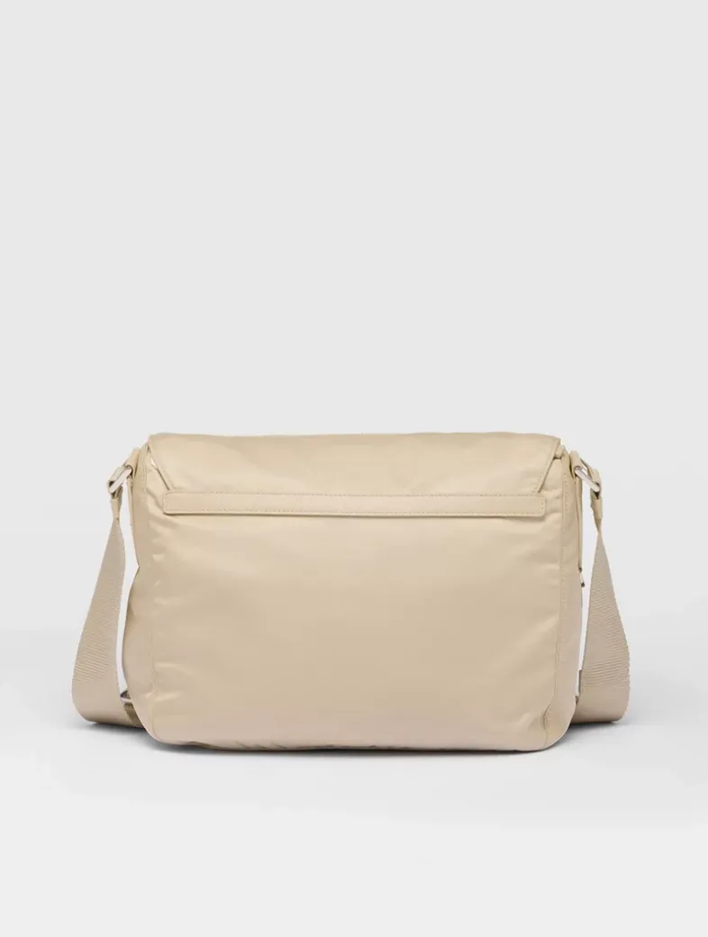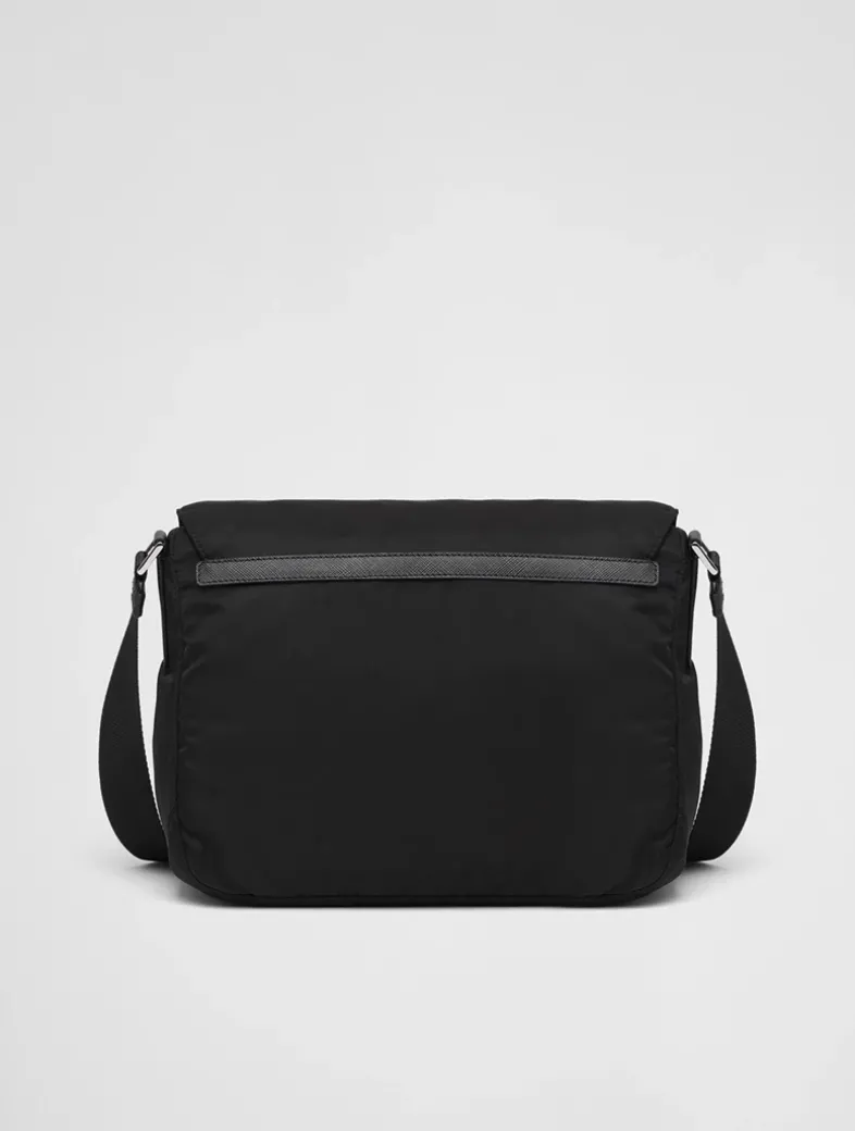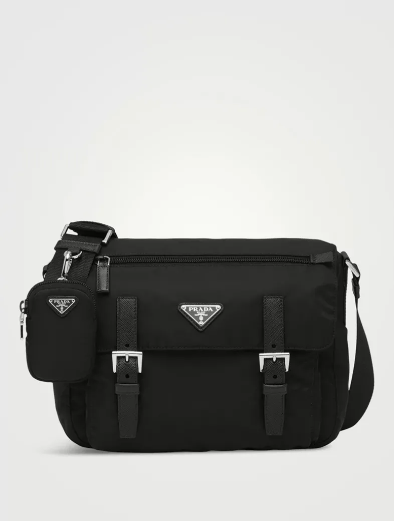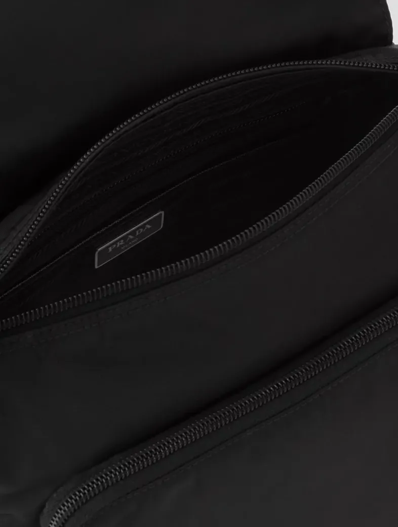 Adjustable 95 cm woven tape shoulder strap Removable Re-Nylon pouch with zipper closure Zipper pockets Flap pockets Metal hardware Enameled-metal triangle logo on flap Closure with zipper, flap and buckle Re-Nylon logo lining, two inner pockets, one with zipper