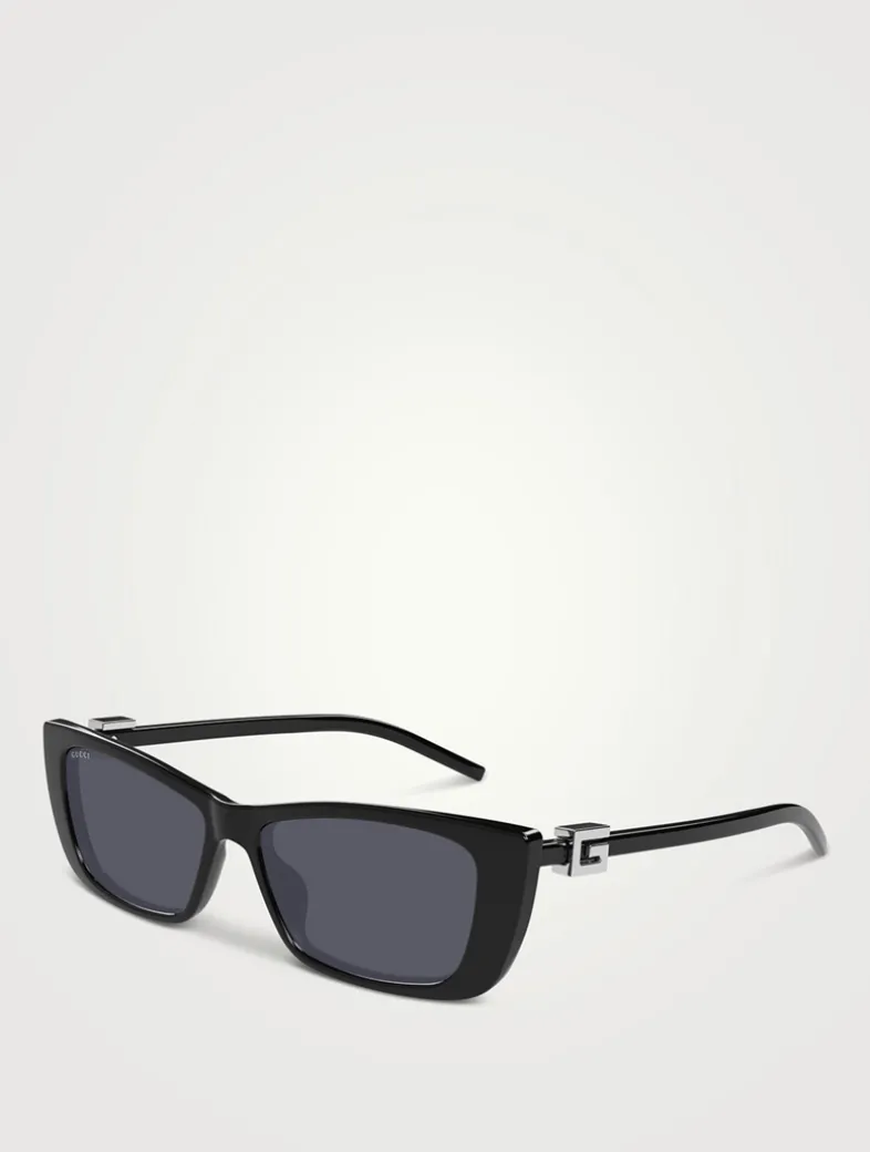 This Gucci eyewear collection combines the coveted silhouettes of bygone decades with a contemporary logo feel. These flared rectangular frames feature a Square G motif at the temples.