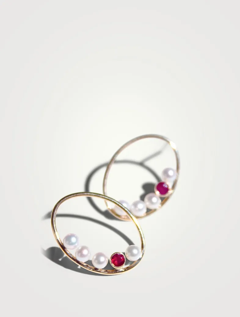Handcrafted in solid 14k recycled gold, each earring features four lustrous pearls arranged inside the oval frame, with a vibrant ruby set in between. The combination of the pearls and the ruby adds a touch of luxury and sophistication,