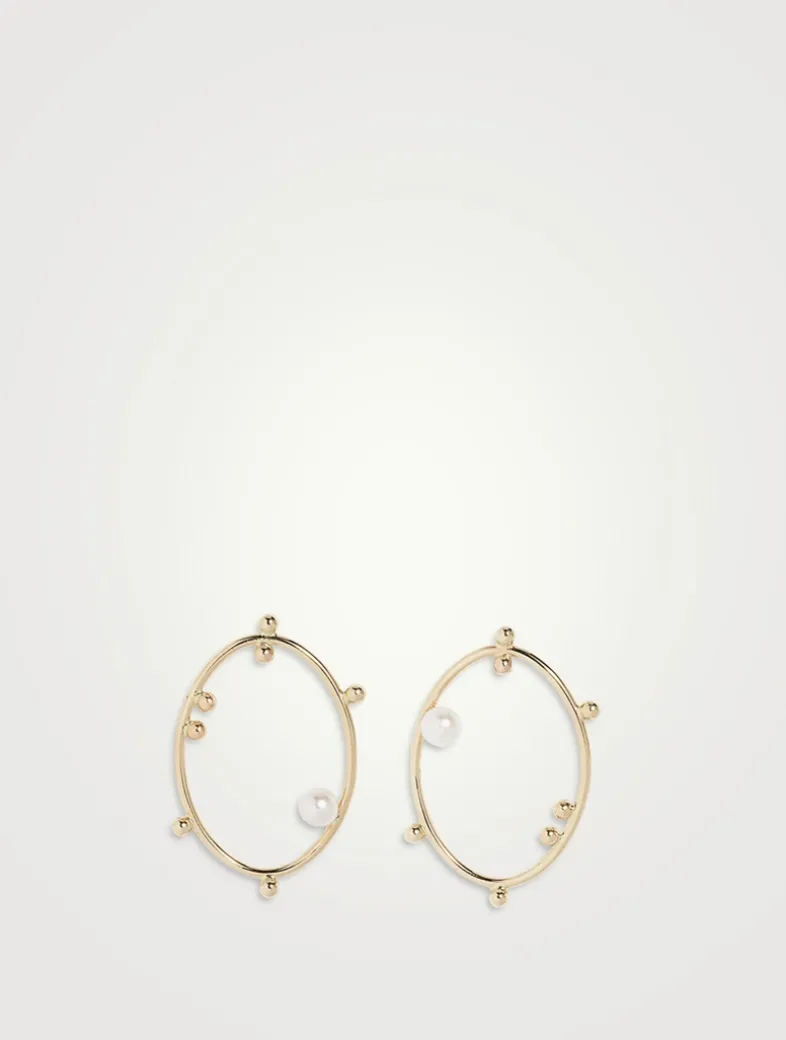 Handcrafted in solid 14k recycled gold, this pair of earrings’ chic oval shape gives a sleek, elongated look, while the delicate detailing of gold dots and the single pearl nested inside add a touch of intricate beauty to the overall design.