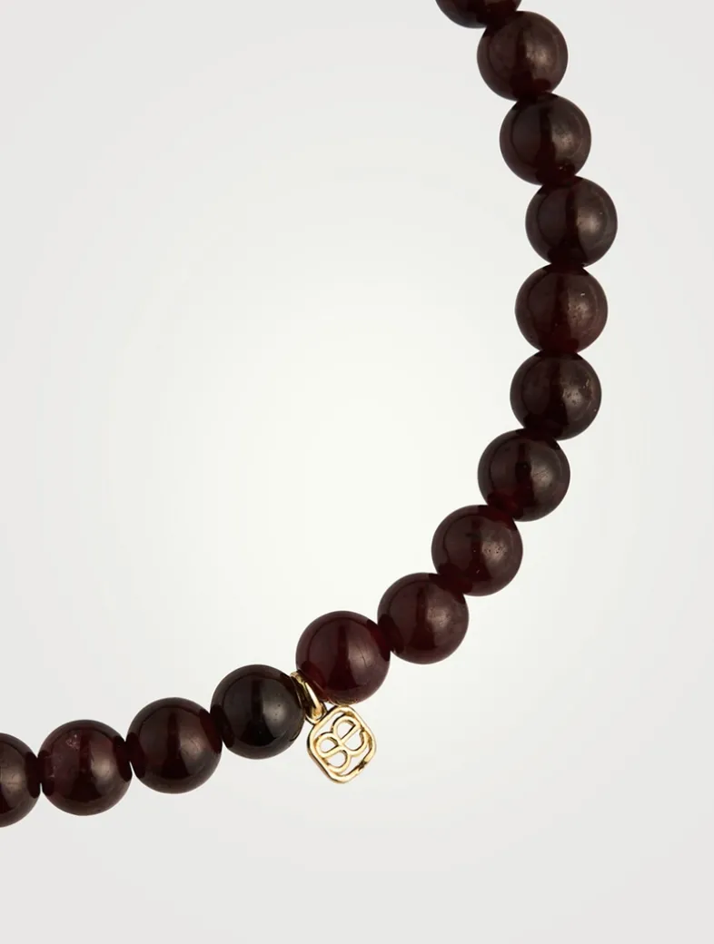 Strung with red garnet beads, this slip-on bracelet features a small diamond chai charm. All Sydney Evan beaded bracelets are strung on a stretch cord along with a 14k gold SE logo charm.