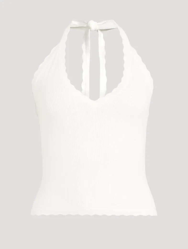 Devon Lee Carlson designed this collection for Reformation. Inspired by her personal style, each piece is made with sustainable materials. This curve-hugging top is knit from an organically-grown cotton blend and finished with slim halter straps that knot at the nape of the neck. Certified to the Global Organic Textiles Standard (GOTS).