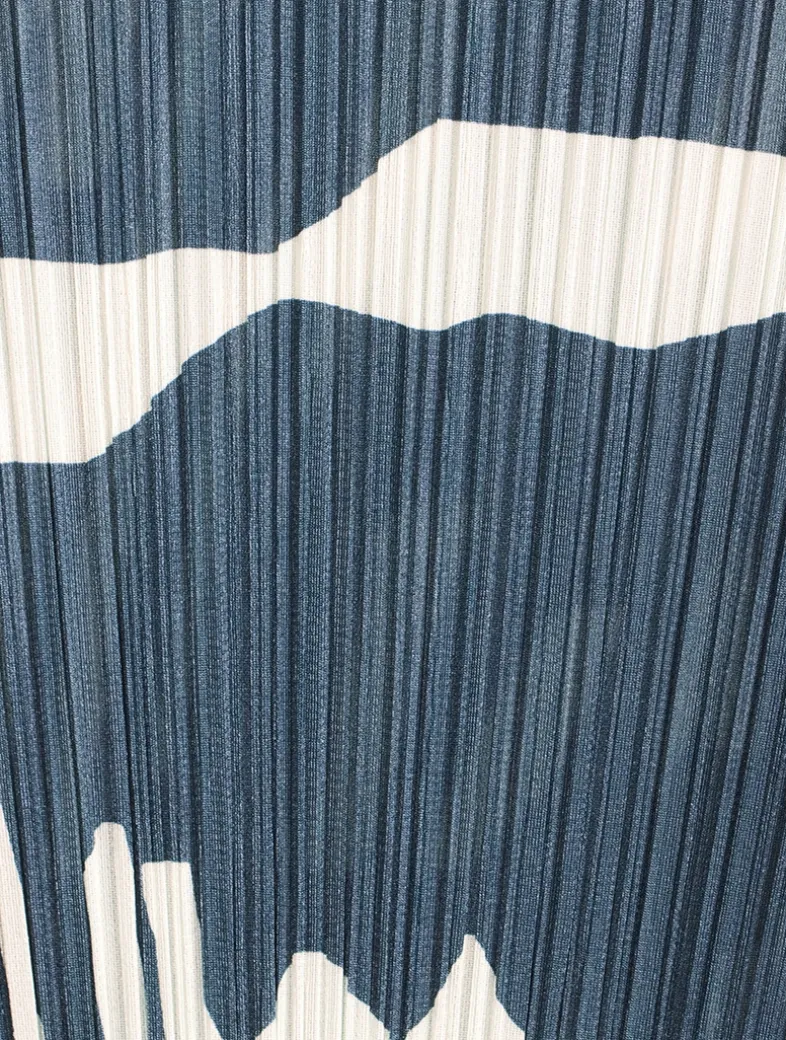 The dynamic print of Refraction is inspired by light playing on the surface of water. This sleeveless pleated tunic has a flared silhouette and a round neckline.