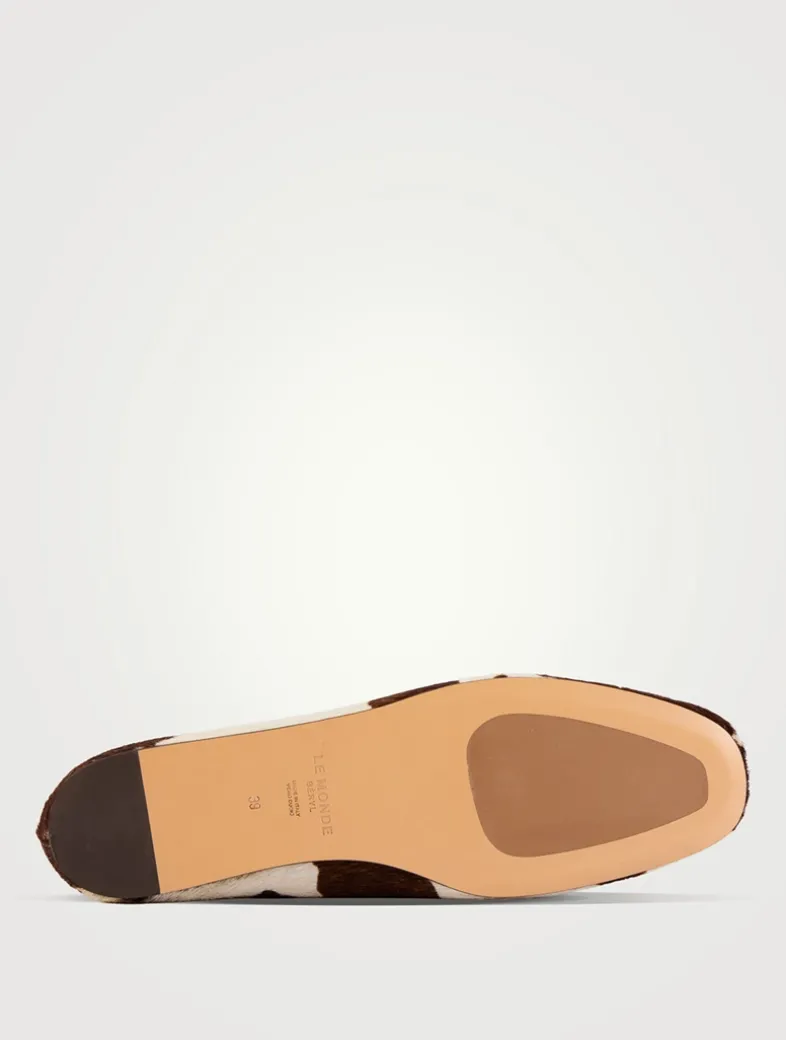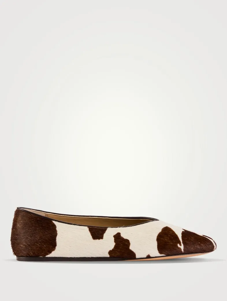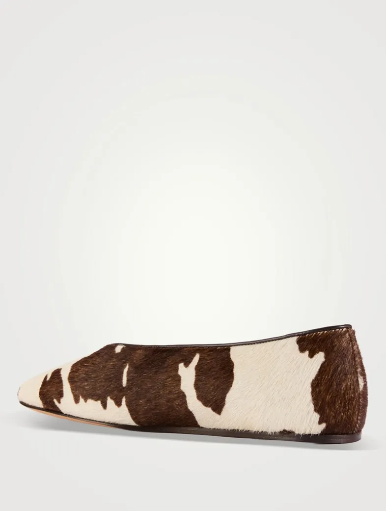 A striking cow print lends a bold touch to these ballet flats. Crafted in Italy from soft calf hair leather, they have a rounded almond toe and a slip-on design.