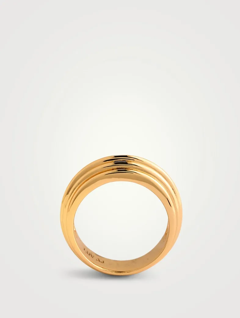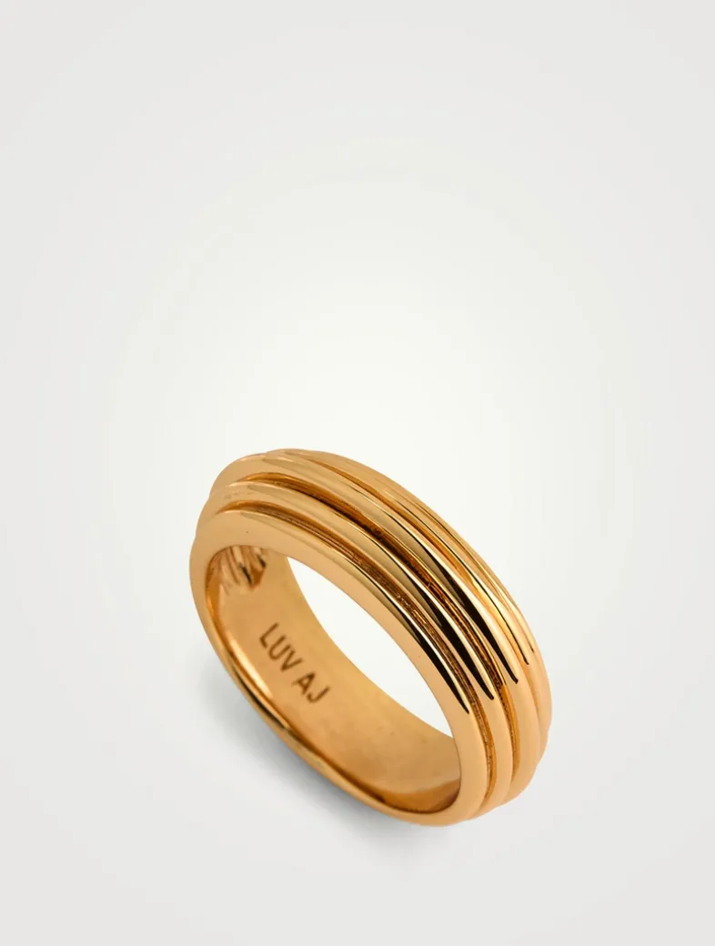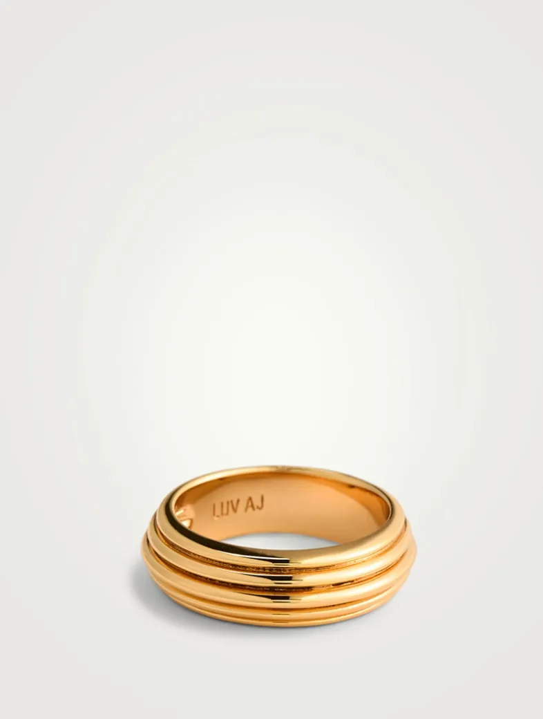 This ring features a unique ridged design, providing a comfortable and secure fit for everyday wear. All Luv Aj jewellery is waterproof and tarnish resistant. Luv Aj uses Ion Plating, which is a Physical Vapor Deposition (PVD) process used to create durable, long-lasting finishes on metal. The base metal is brass, which then is plated with at least 0.1 micron of 14K Gold or Silver, plus e-coating which qualifies it to pass waterproof tests. Ring is 100% nickel-free and cadmium-free.