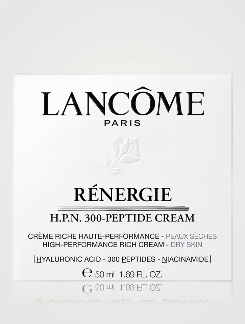 Discover for the first time a unique concentration of Hyaluronic Acid, 300 types of Peptides, and the power of Niacinamide in one high-performance cream. The highest concentration ever made by Lancôme. This high-performing formula H.P.N. 300-PEPTIDE CREAM has been specially recalibrated to deliver higher hydration for dry skin types without compromising on anti-aging performance. The new formula is augmented with 9.8% of squalane to support skin hydration and suppleness. With one application, skin is rehydrated and gains firmness.