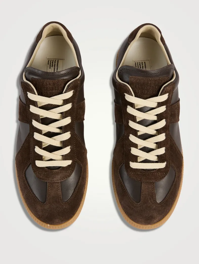 The Replica sneakers in a tonal mix of leather and suede are inspired by Austrian sports shoes from the seventies.