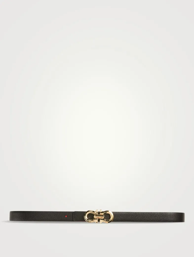 Fully reversible, this slim belt is made from hammered calf leather. It features a stylized Gancini silhouette buckle.