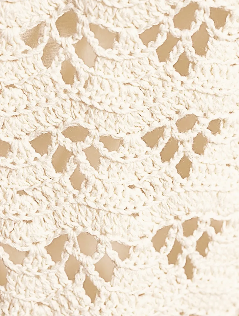 Flaunting a summer-ready aesthetic, this long-sleeve knit dress features contrasting scalloped edging at the neckline, cuffs, and hem. It has a cotton crochet construction with a deep scoop neckline and an A-line silhouette.