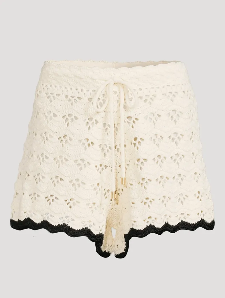 A knit short featuring scalloped edging, contrast trims along the hem, and an open-weave crochet pattern. Cut to a relaxed, mid-rise silhouette, they are topped with a drawstring waistband.