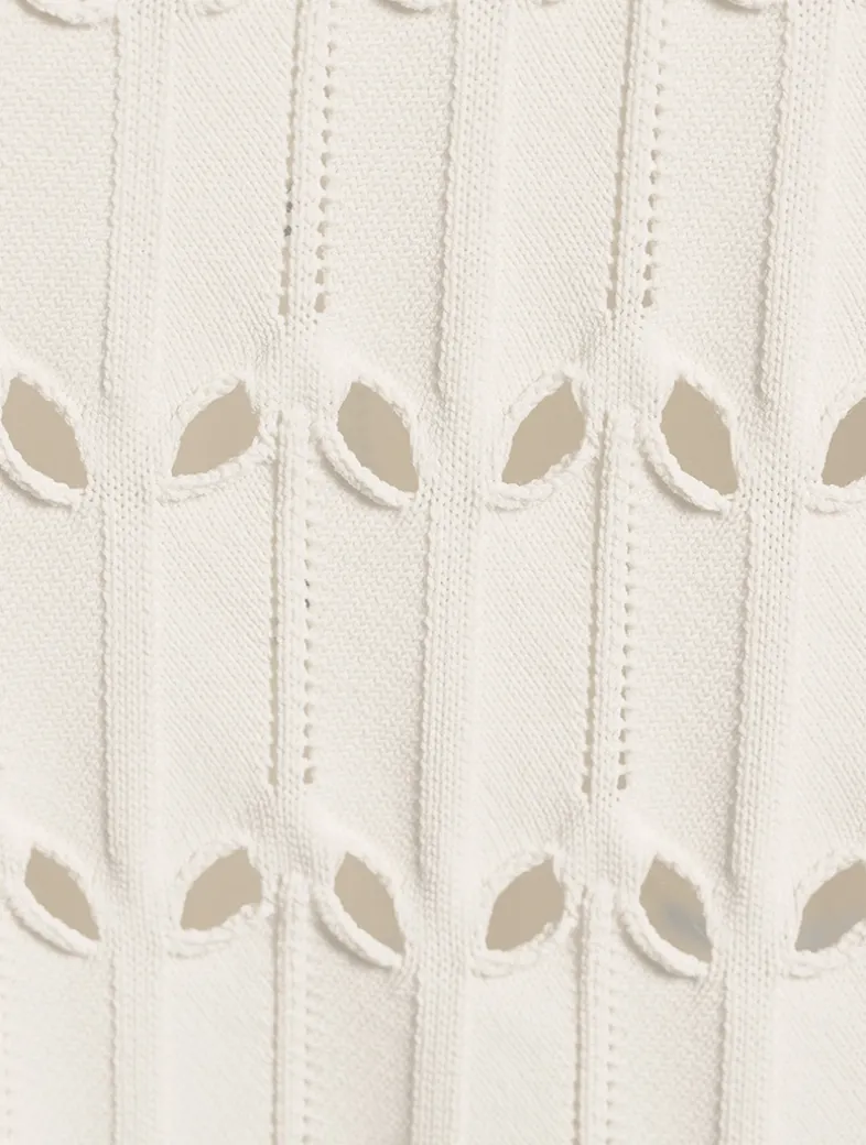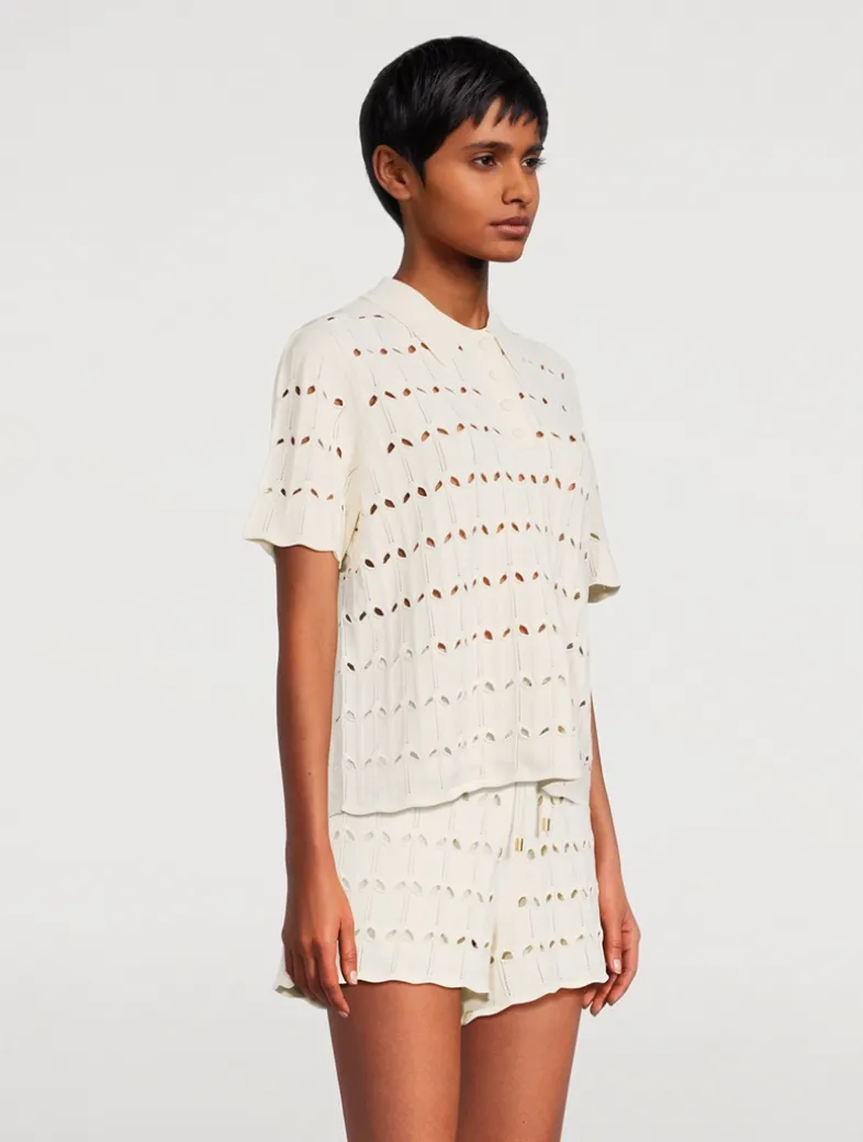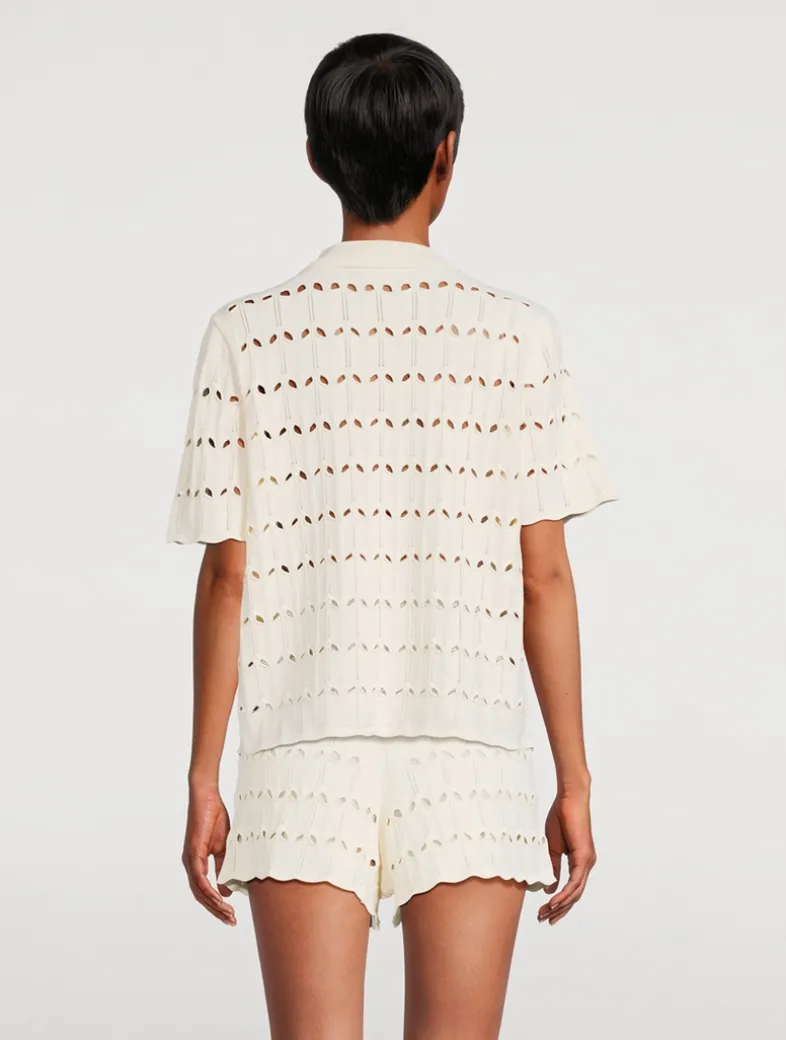 A knit polo top featuring a classic pointed collar, short sleeves, and covered buttons down the centre front. It is embellished with pointelle details and scalloped edges at the hem and cuffs.