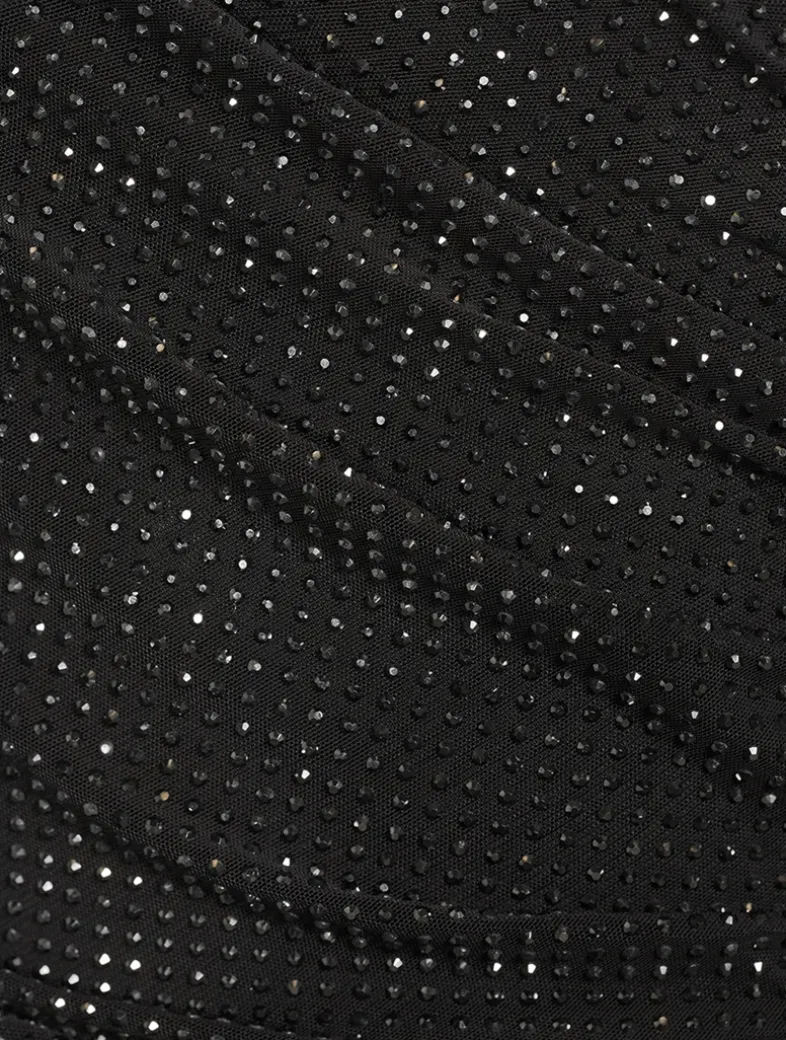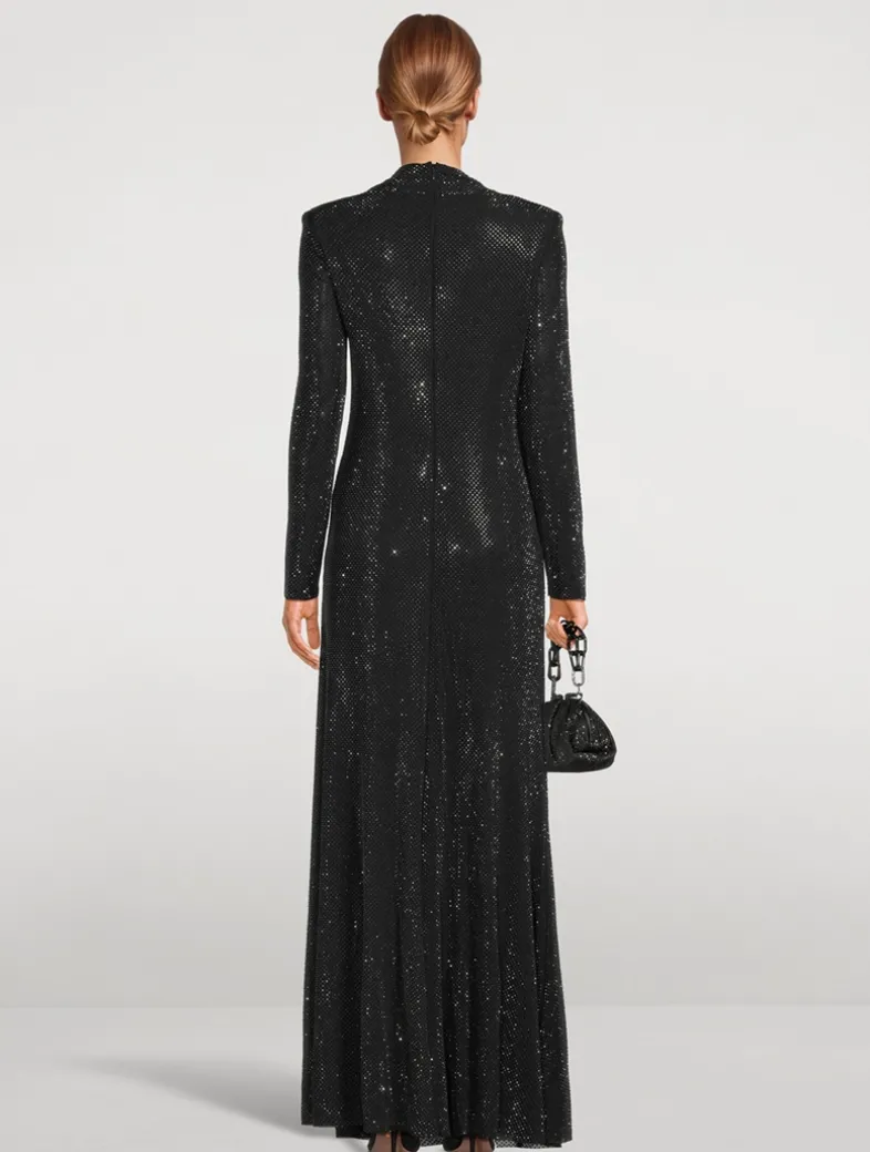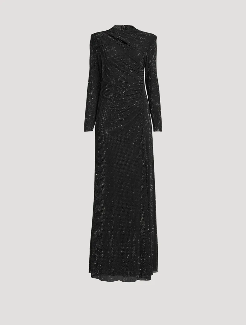 Crafted from rhinestone-studded mesh, this floor-sweeping dress pairs its striking, high-shine feel with a sleek silhouette and an edgy cut-out to match. Finished with a mesh lining, removable shoulder pads, and a zip closure at the back.
