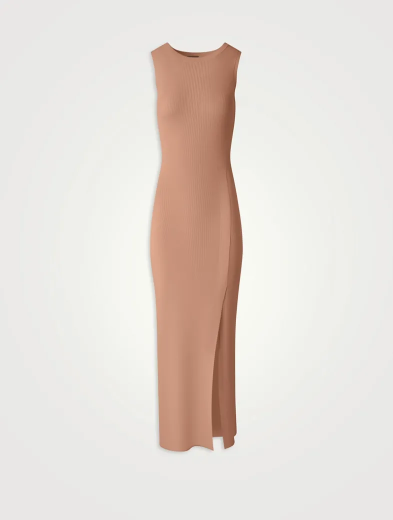 In a crêpe stretch fabric, this body-hugging tube dress is modern and minimal. The simple round neck and midi length are offset by the racy thigh-high slit at the side.