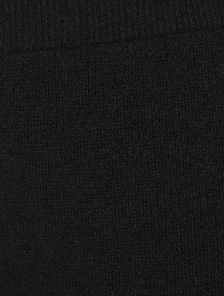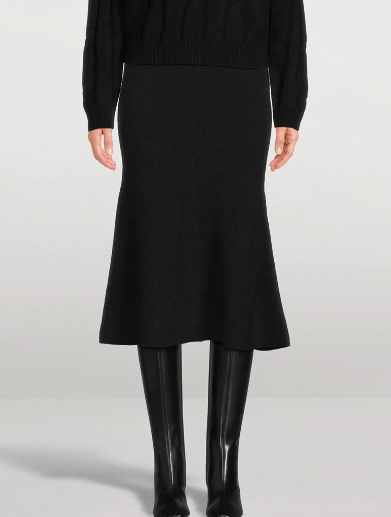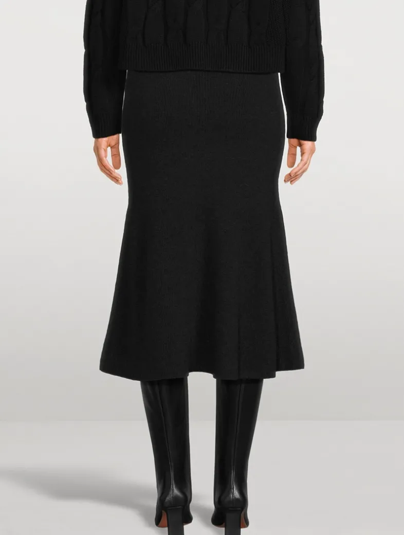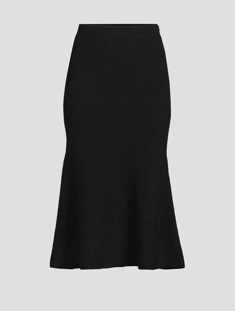 Knit from cashmere with a hint of stretch, this ribbed skirt has an elastic waistband for an easy, pull-on design. It fits slim around the hips and flares to a fluttering mid-calf hem.