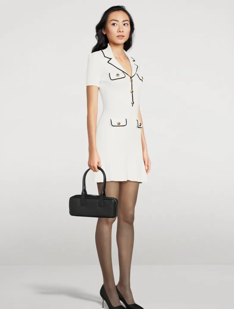 Cut from ribbed knit for a soft yet sculpted fit, this dress boasts a flared hem that adds a playful touch to its contrast piping and timeless accents. Finished with functional pockets and removable shoulder pads.