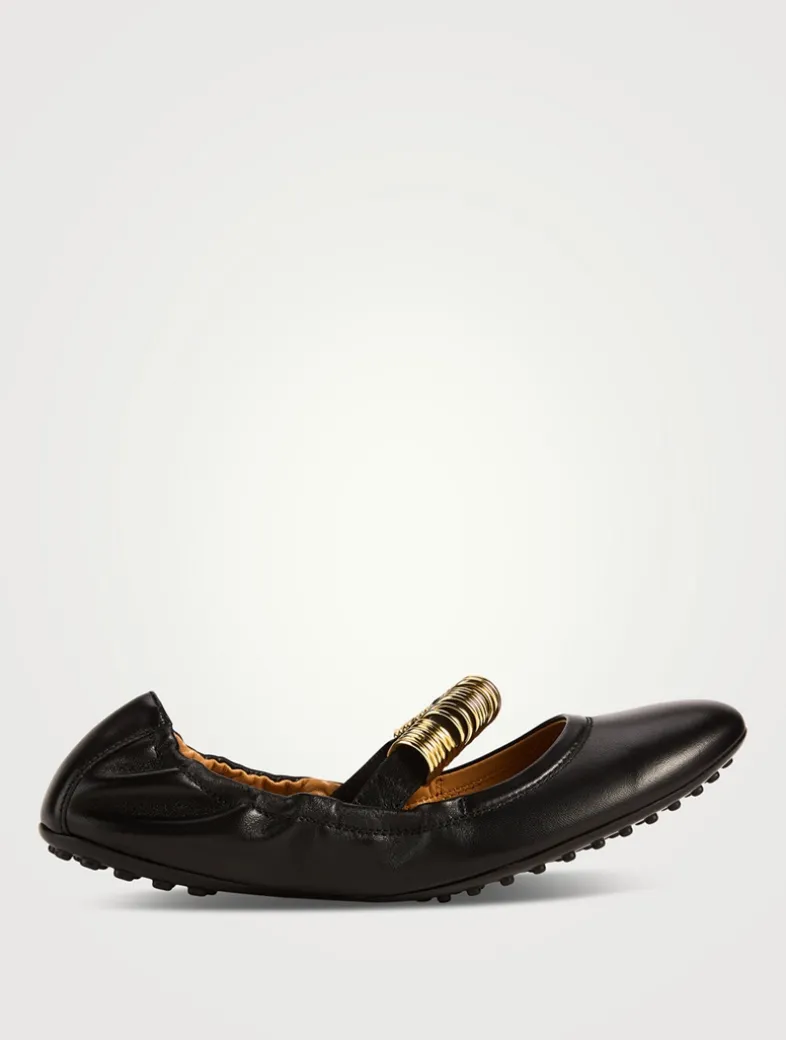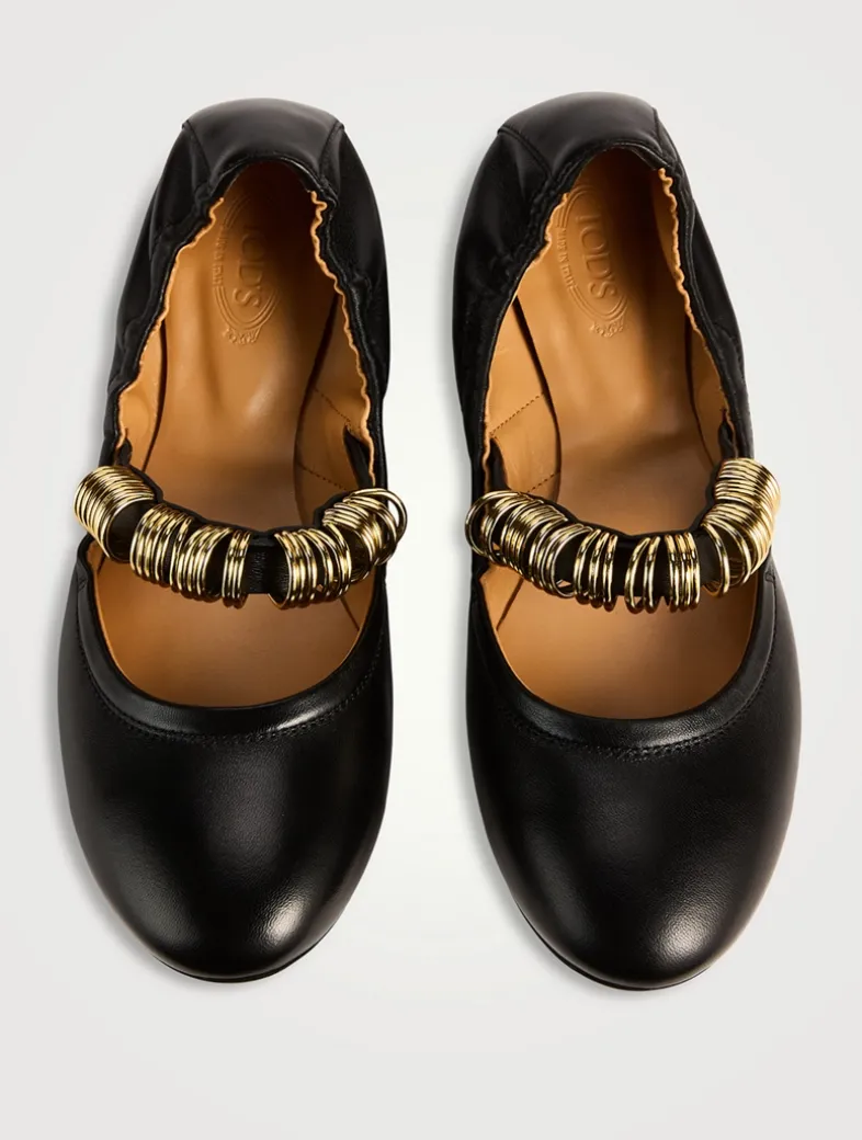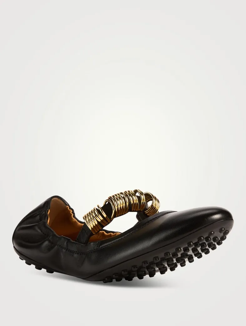 These ballerinas are crafted in soft nappa leather with elastic piping and a Mary Jane-style strap with metal rings. Featuring a rubber outsole with embossed rubber pebbles, they are perfect for an easy chic look.