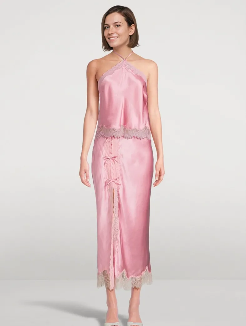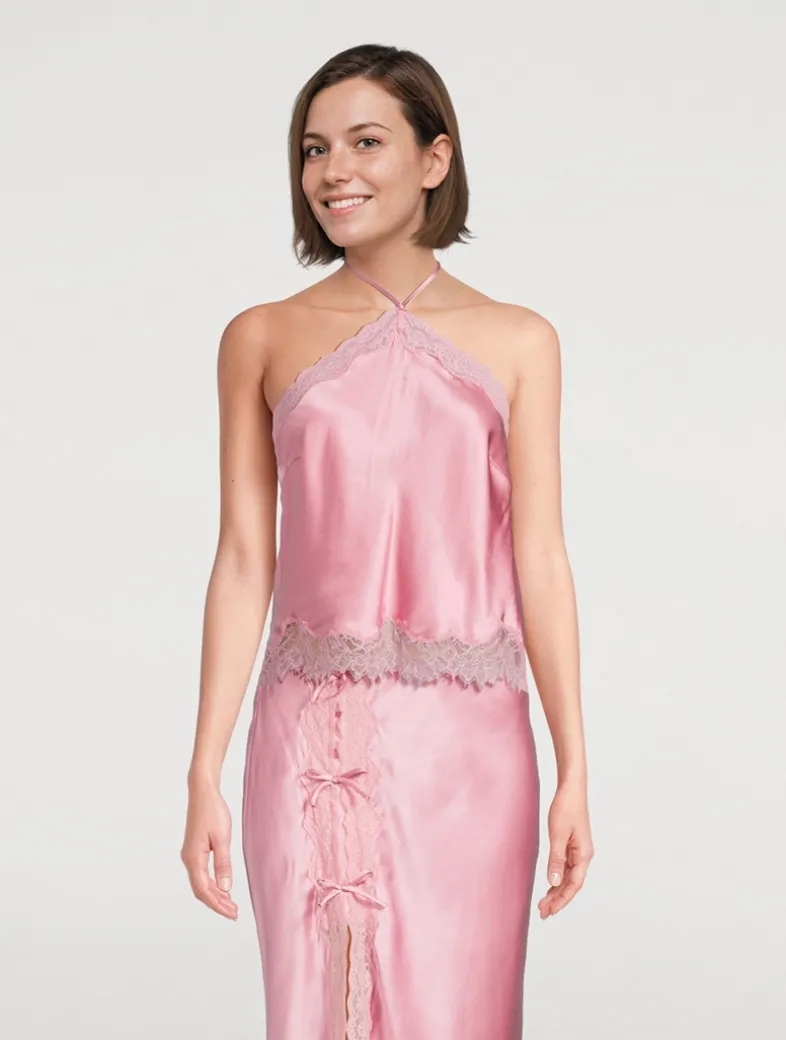 This bias cut cami halter is crafted from a silk charmeuse, drapey fabric with delicate Chantilly lace trims. Featuring a self tie at the back, this elevated top is finished with lace trimming at the neck and the hem.