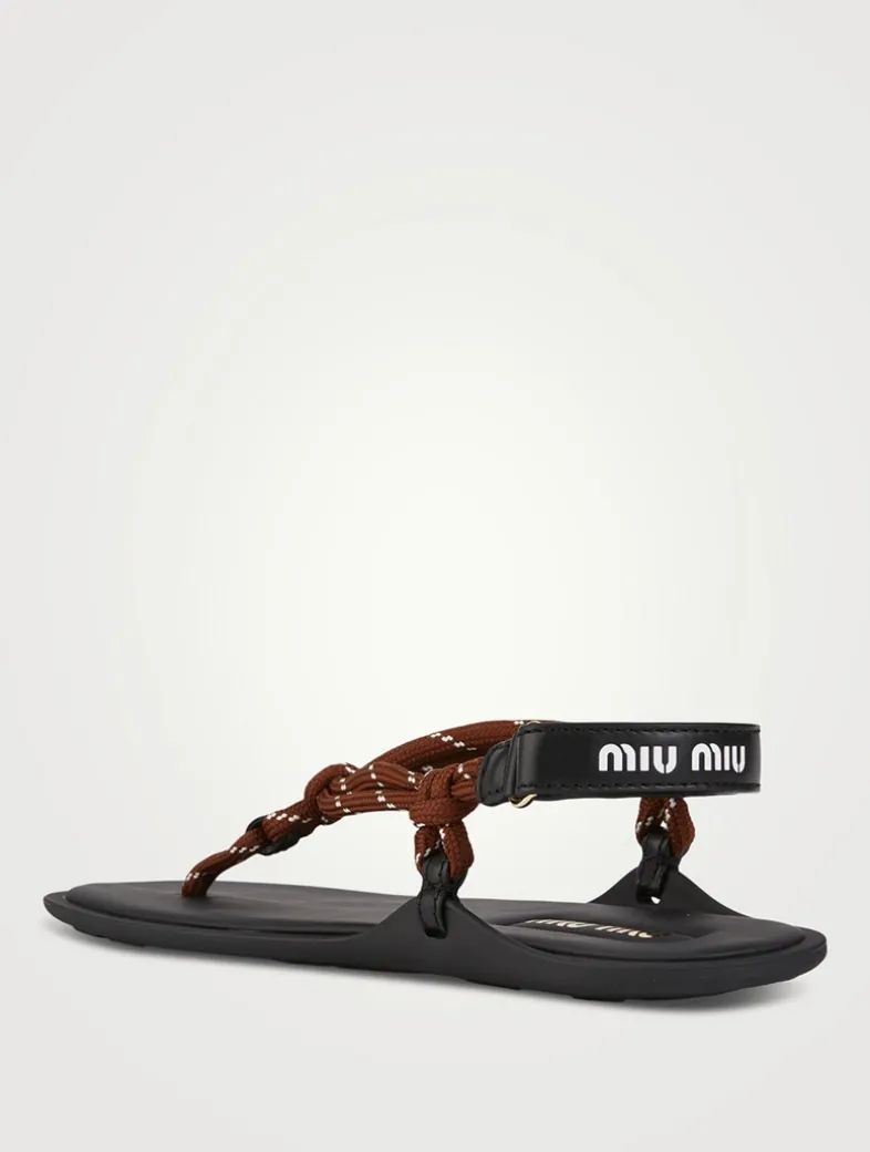 Protagonists of the SS24 fashion show, the Riviere sandals are characterized by their playful, sporty touch created by cord that unexpectedly goes with any look. The Miu Miu logo adds its signature touch to the flat shoe.