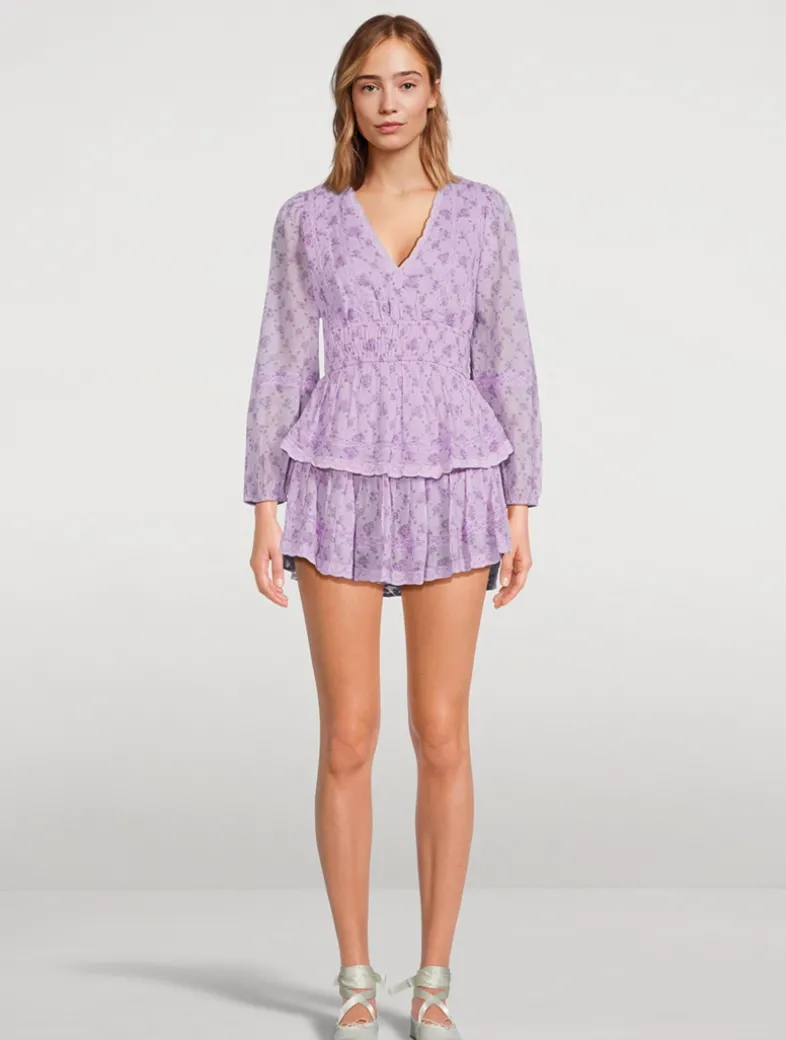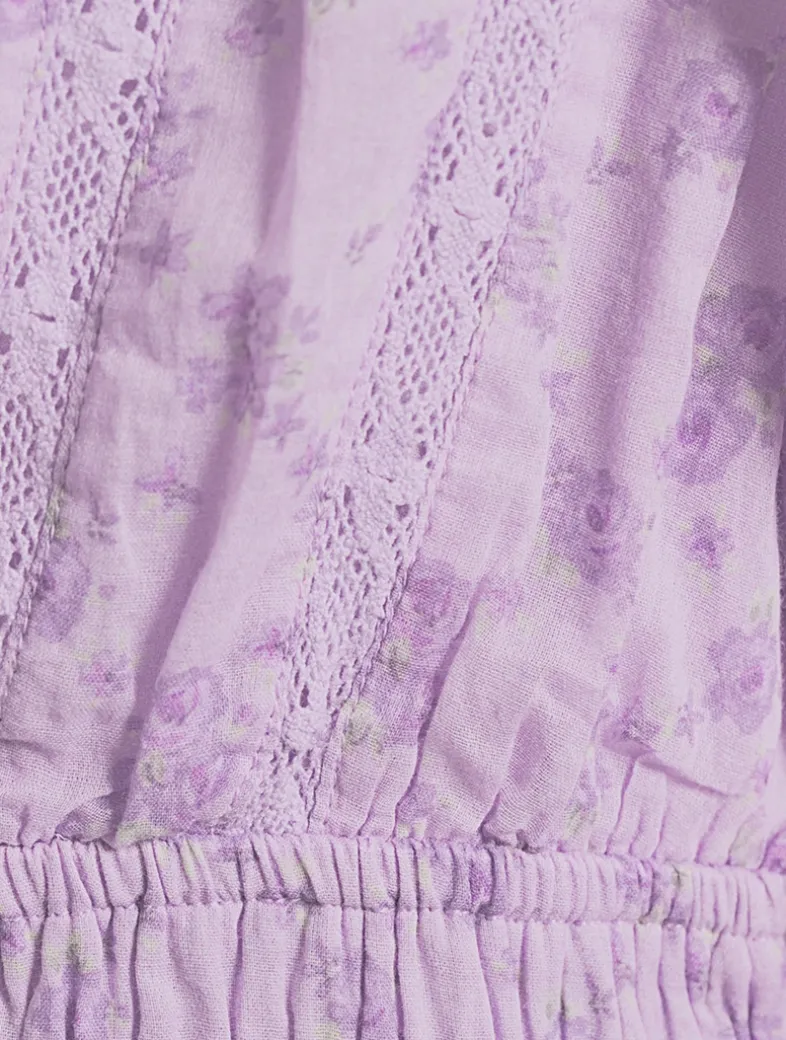 Crafted from cotton, this dress has a playful, mini length featuring a charming blossom print all over. Delicate lace trim highlight the neckline, sleeves, and tired skirt, while smocking at the waist ensures the perfect fit.