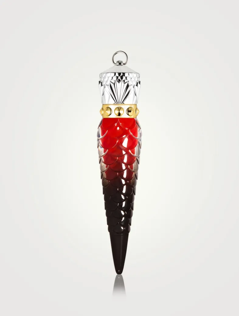Christian Louboutin expands his Rouge Louboutin collection with Loubibelle Lip Beauty Oil in his iconic shade of red. The lightweight, non-stick beauty oil contains jojoba oil to moisturize and soften lips. The glossy Rouge Louboutin colour adds dimensions, giving the appearance of fuller lips. Encased in a vial with a mermaid tail pattern and an ombre effect, it is crowned with a turret-like crown reminiscent of the Middle Eastern antiquities and the Art Deco movement. The decorative case can be worn as a necklace.