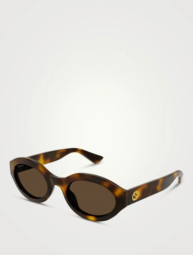 Crafted with an injection frame, these contemporary oval-shaped sunglasses are illuminated with a gold-toned Double G logo across the temples.
