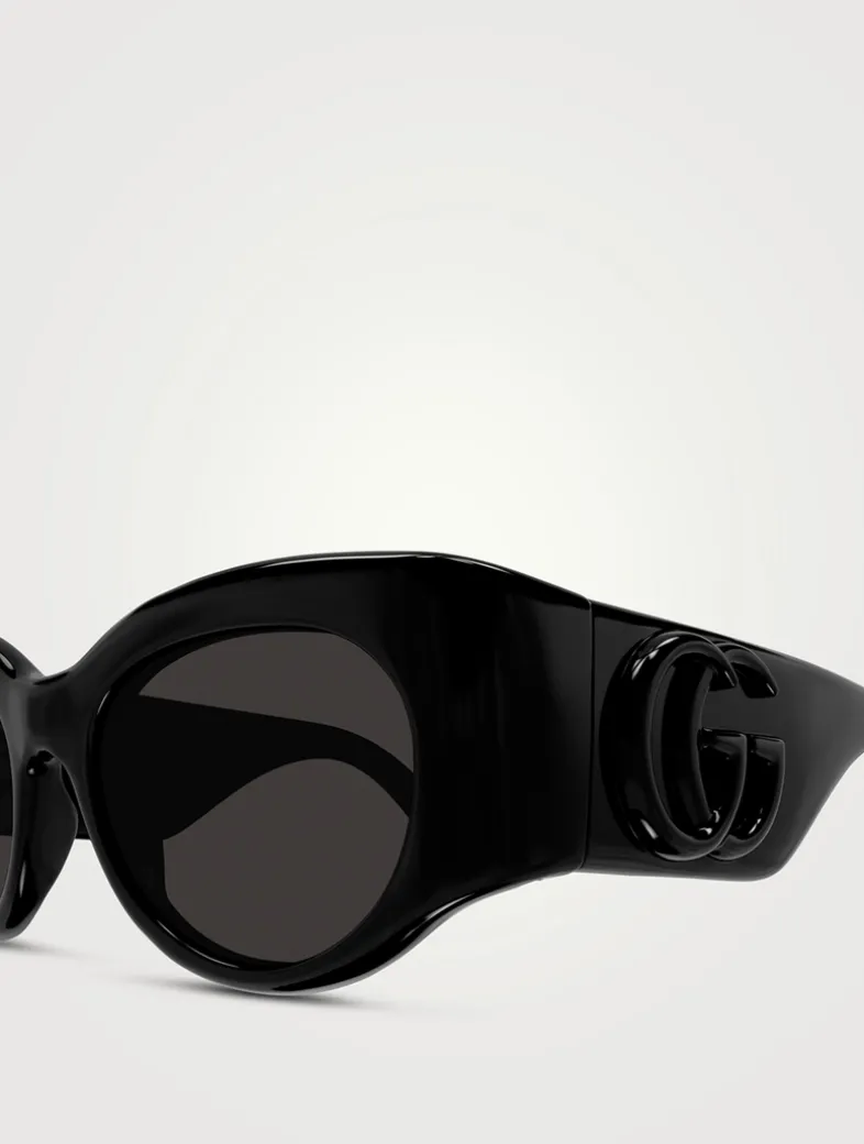 Made with a bold glossy injection frame, these round sunglasses have a sleek upswept shape. Tonal Double G’s at the temples are a modern, signature finish.