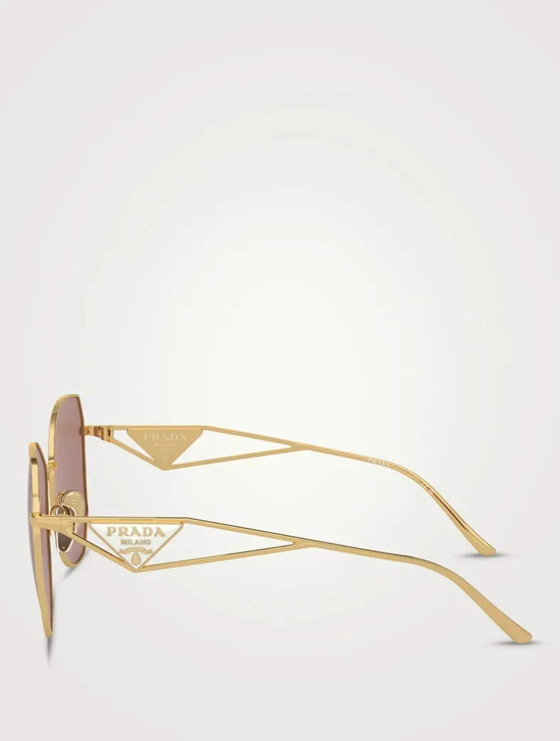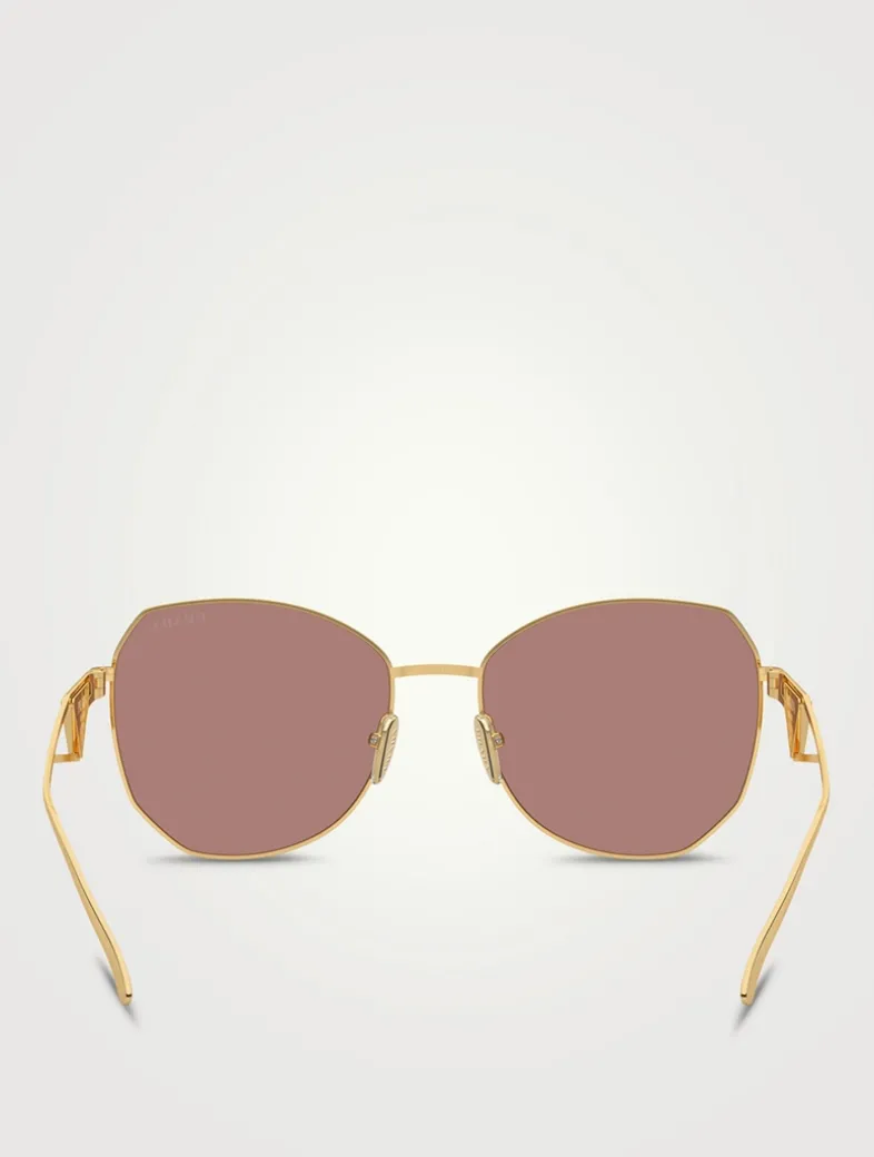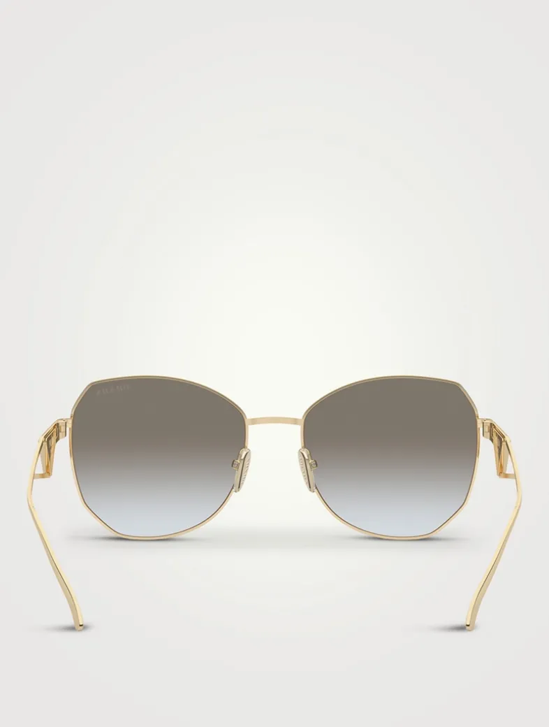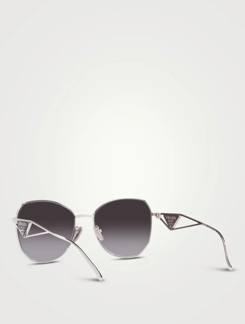 Crafted with a polished metal frame, these rounded sunglasses are accented with classic PRADA triangle logos at the temples. This style is RX-able.